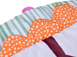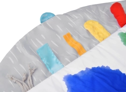 Ta velika, okrogla otroška podloga ponuja udobno, podloženo površino in prilagodljivo uporabo: kot igralno gnezdo z loki za obešanje igrač ali kot samostojna podloga za prosto igro in vadbo na trebuščku. Visok kontrast vzorcev, raznolike teksture in nežni zvoki naravno spodbujajo čute ter razvijajo fino in grobo motoriko.