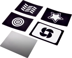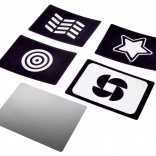 Visok kontrast, različne teksture, šumeči in ropotajoči elementi podpirajo vid, sluh in tip. Zrcalce in kartice spodbujajo dojenčka k opazovanju in osredotočanju.