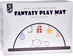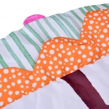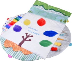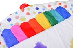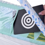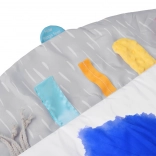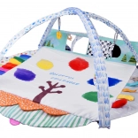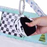 V kompletu je pisana izbira dodatkov: zrcalce za samospoznavanje, kontrastne kartice za vizualni razvoj, plišaste viseče dodatke, grizala, ropotuljo in šušteče detajle. Podloga se hitro zloži, je lahka za prenašanje in preprosta za vzdrževanje – idealna doma in na poti.