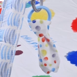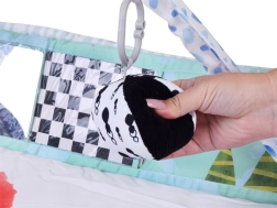 - Podloga, 2 loka, komplet visečih igrač: zrcalce, kontrastne kartice, grizala (zvezdice), mehak kontrasten žogica, ropotulja, šušteči elementi