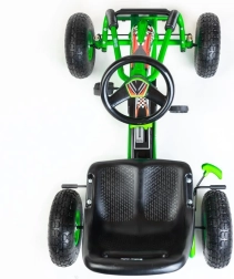 Široka napihljiva kolesa z ležaji (25 × 8 cm) dušijo neravnine in zagotavljajo boljši oprijem. Nastavljiv športni sedež se zlahka prilagodi otrokovi višini, kar podpira pravilno držo in udobje tudi pri daljši vožnji. Zaščitni pokrov verige in plastični ščitniki povečujejo varnost in vzdržljivost celote.