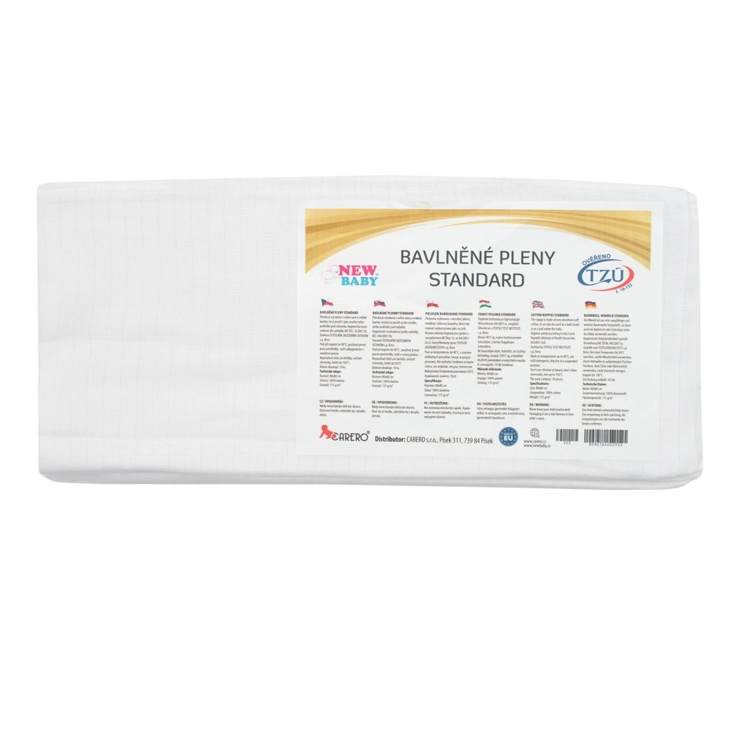 Klasične bombažne pleničke NEW BABY velikosti 80×80 cm so idealne za vsakodnevno uporabo. Izdelane so iz 100 % bombaža z gramatura 115 g/m², imajo 2 čvrsta in 2 zašita roba za večjo vzdržljivost in ohranitev oblike. Pakiranje vsebuje 10 kosov. Pleničke so preverjene pri Tekstilnem preizkusnem inštitutu v Brnu. Sušenje v sušilnem stroju ni priporočljivo.