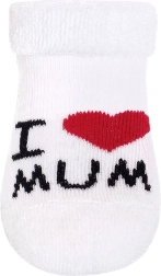 Mehke otroške frotirne nogavičke New Baby bodo vašemu dojenčku zagotovile toploto in udobje tudi v hladnejših dneh. Zahvaljujoč elastičnemu robu nikjer ne tiščijo, držijo obliko in s motivom I Love Mum and Dad razveselijo vso družino.