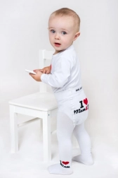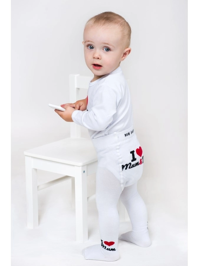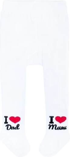 Odkrijte udobje in kakovost otroških hlačnih nogavic NEW BABY v beli barvi. Zaradi visokega deleža bombaža so nežne do otroške kože, elastičen material se odlično prilagodi in zagotovi udobno nošenje skozi ves dan. Prisrčen motiv I Love Mum in I Love Dad jih naredi odličen dodatek v garderobi vsakega malega raziskovalca.