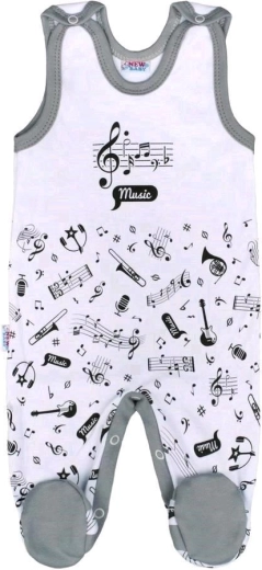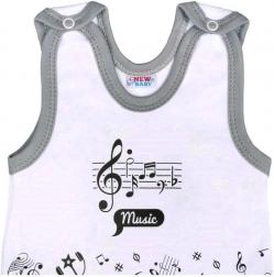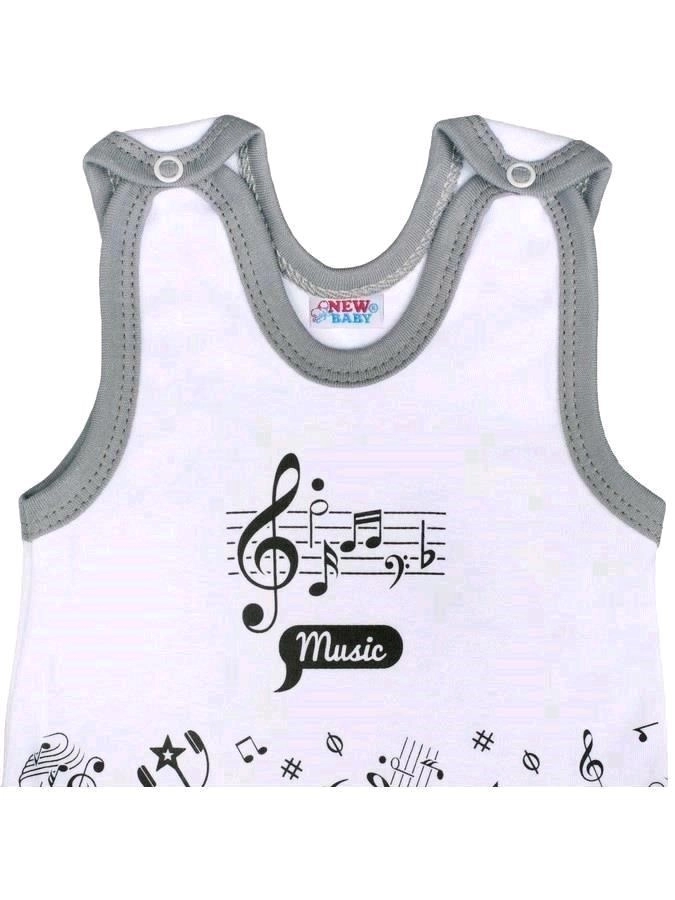 Pajac NEW BABY MUSIC iz prijetnega bombažnega džersija ponuja dojenčku mehkobo, zračnost in udobje skozi ves dan. Enobarvni zgornji del dopolnjuje izviren potisk z notami in napisom Music, spodnji del pa je v celoti potiskan z noticami in glasbili – ljubek videz za male ljubitelje glasbe.