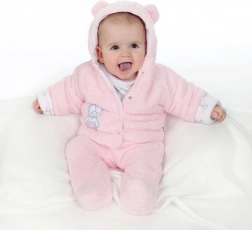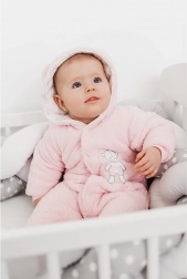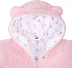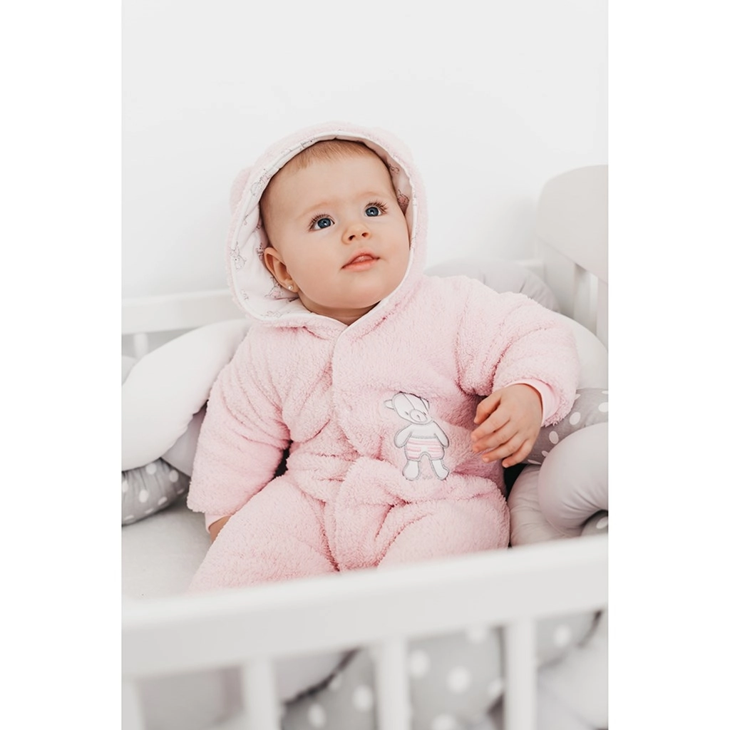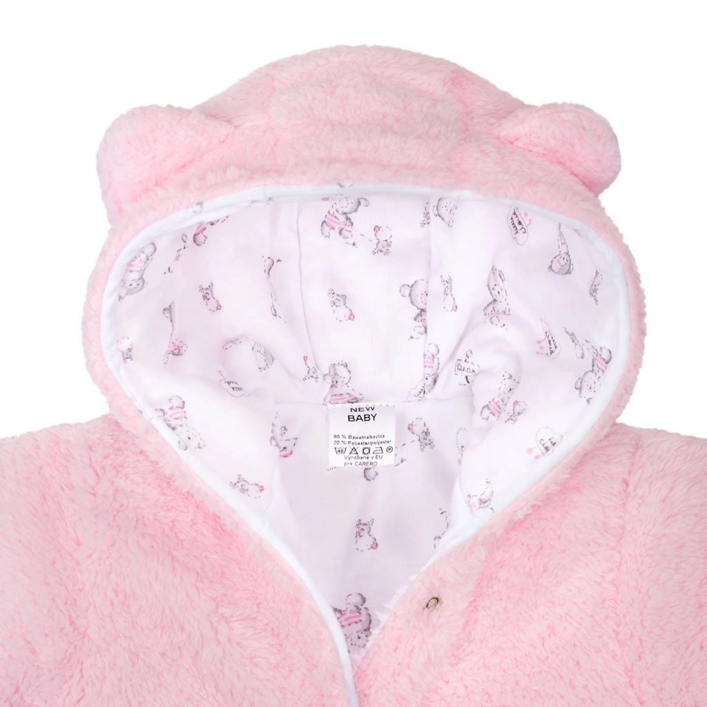 Ta zimski dojenčkov kombinezon New Baby Nice Bear v rožnati barvi bo vašemu malčku zagotovil prijetno toplino in mehkobo skozi ves hladen dan. Zunanja plast iz flisa greje, medtem ko je notranja 100 % bombažna podloga nežna do občutljive otroške kože. Prisrčen medvedek in kapuca z ušeski dajeta kombinezonu igriv videz.