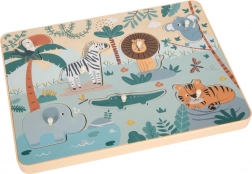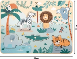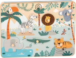 Lesena vstavljanka z zvokom spremeni prve korake učenja v pustolovščino. Otroci nameščajo leva, tigra, slona, zebro, koalo, tukana in krokodila na prava mesta, ob dvigu koščka pa zaslišijo avtentičen živalski zvok. Kakovostna izdelava iz FSC® certificiranega lesa je prijetna na dotik in prijazna do narave.