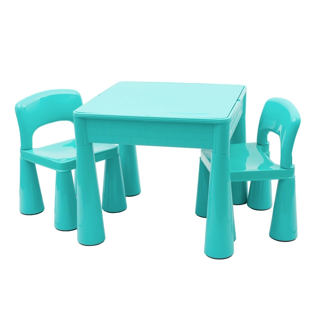Praktičen otroški komplet New Baby je sestavljen iz mize in dveh stolčkov v moderni mentol barvi. Miza ima vrtljivo ploščo – na eni strani gladka površina, na drugi strani podlaga za LEGO in LEGO DUPLO. Pod ploščo je shranjevalni prostor za igrače in likovni material, ki ga je mogoče uporabiti tudi kot mini peskovnik ali za vodne igre. Idealno za otroško sobo in igralnico.
