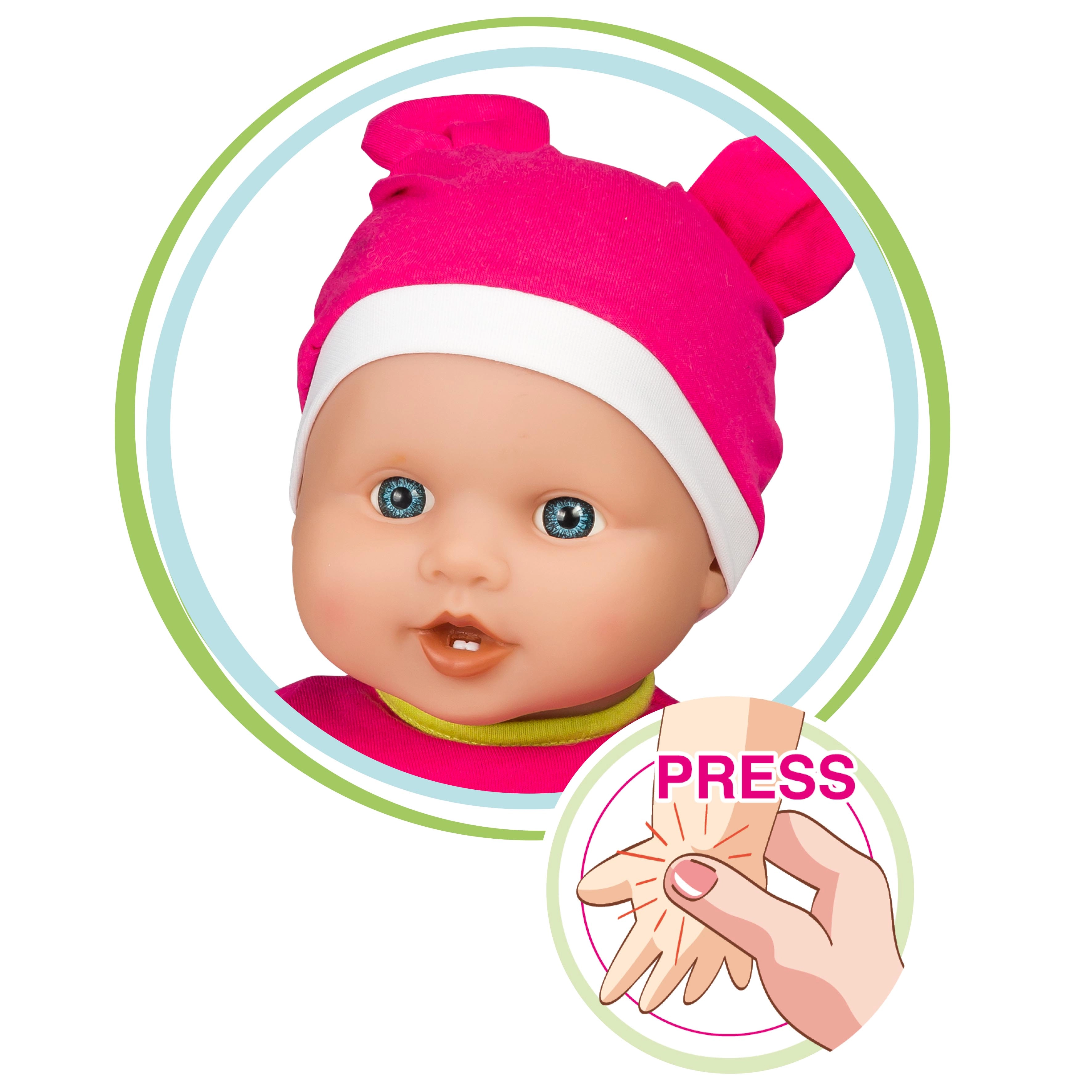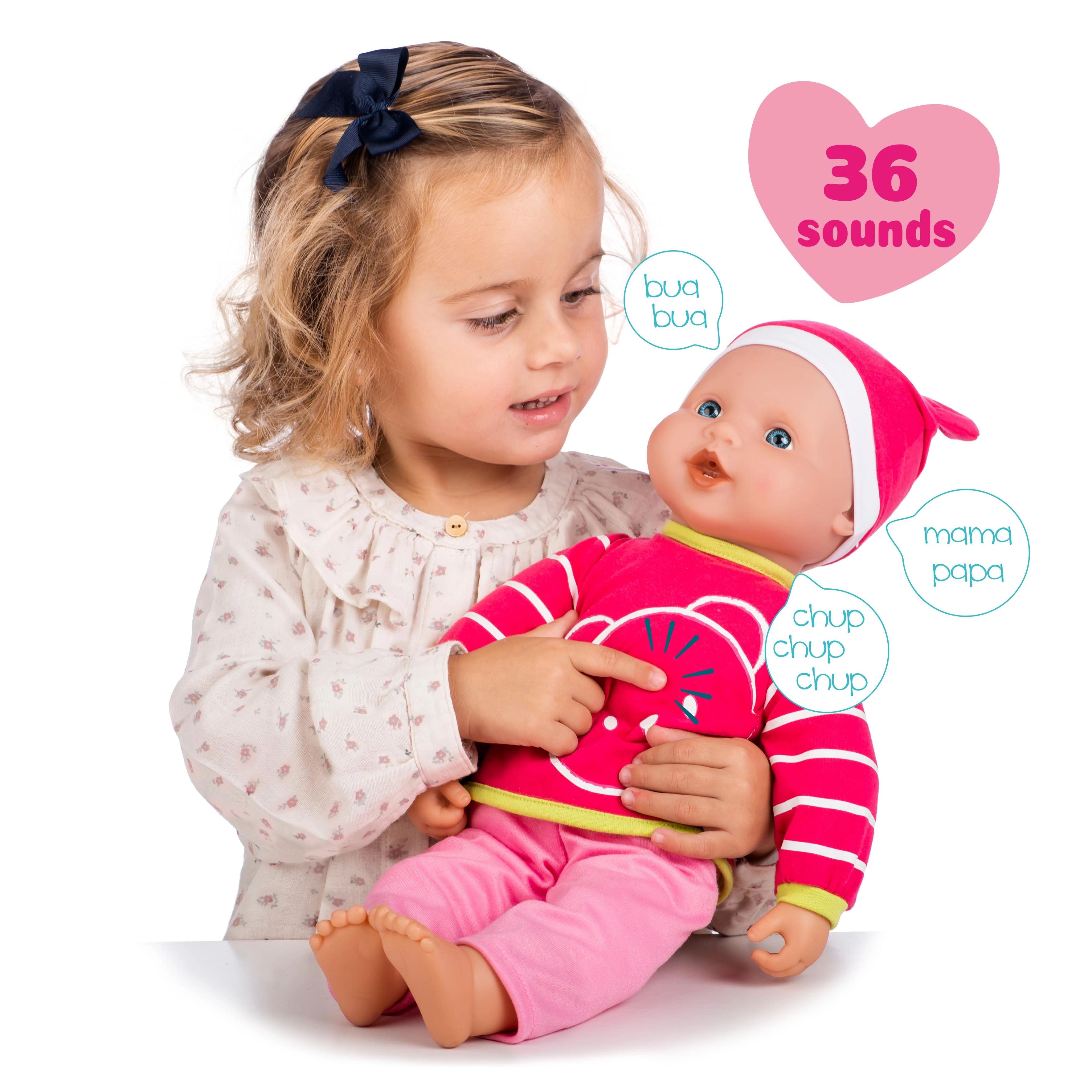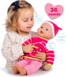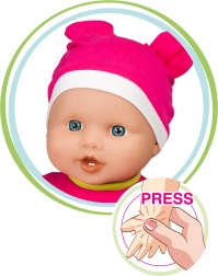 Po pritisku gumba na prsih dojenček oddaja 36 različnih zvokov, ki spodbujajo otroško domišljijo in razvijajo socialne veščine pri igri vlog. Baterije 3× LR44 so priložene, zato se lahko igrate takoj.