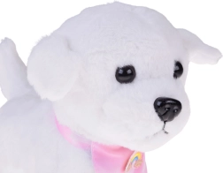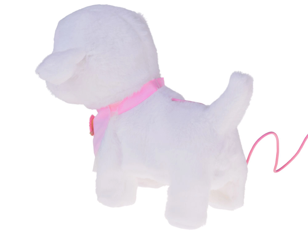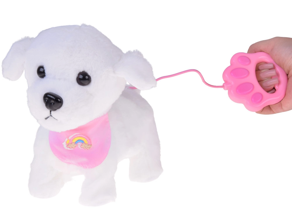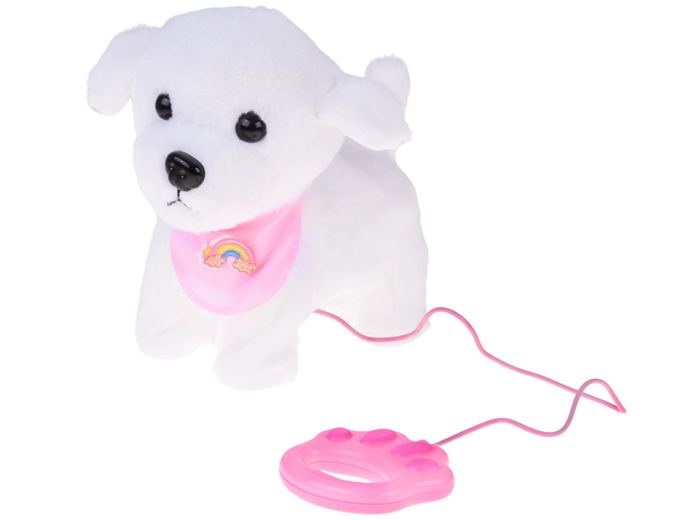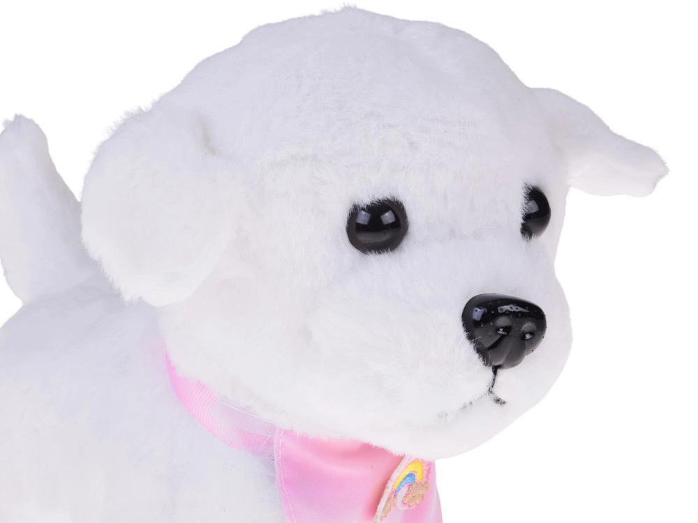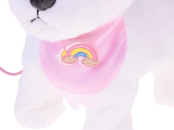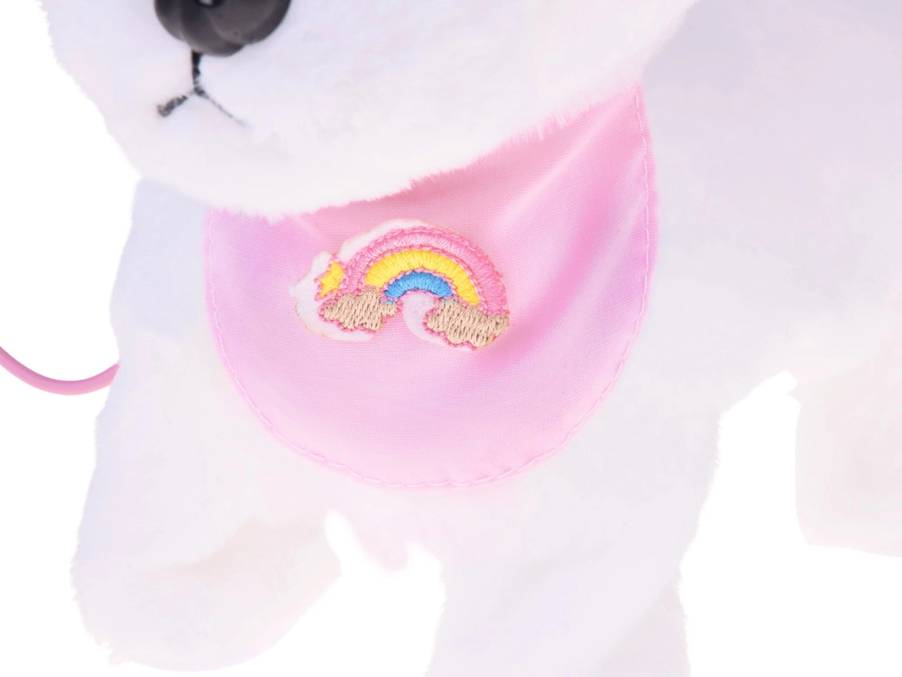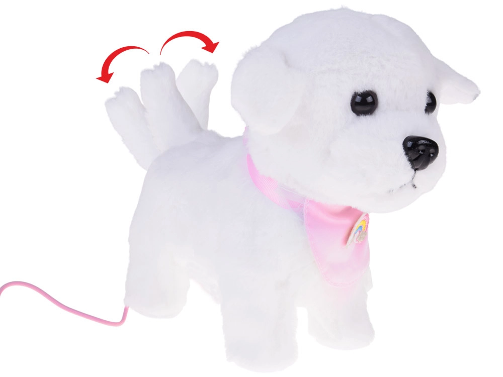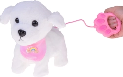 Ljubek interaktivni plišasti kužek na povodcu bo razveselil vsakega malega ljubitelja živali. Ob pritisku na gumb na povodcu hodi, laja, oddaja realistične zvoke in maha z repkom. Narejen je iz mehkega, na dotik prijetnega materiala in krasi ga prisrčna bandana z mavrico – idealen prijatelj za vsakodnevno igro in kot odlično darilo.