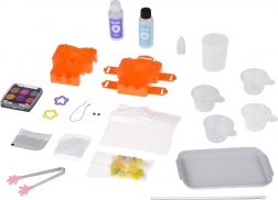 Del seta so kalup, klešče, mešalnik, merilni lonček, 2× lepilo, pigment, dekoracije, rokavice ter praktična posodica in pladenj za čisto ustvarjanje. Preprost priročnik vodi otroke korak za korakom – od mešanja mase do končnega okraševanja in obešanja.