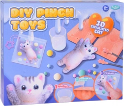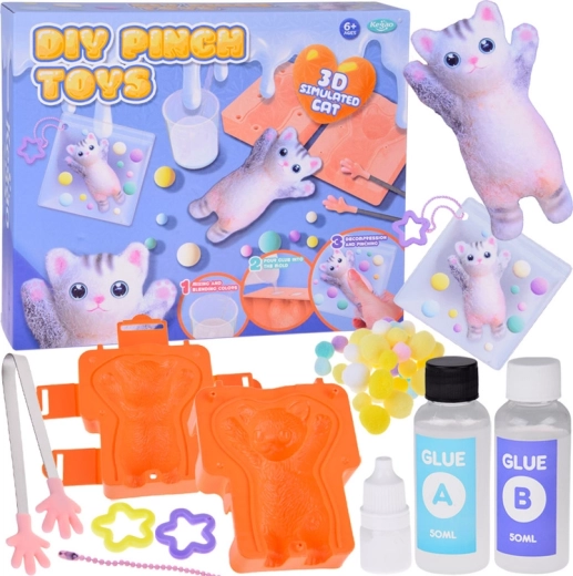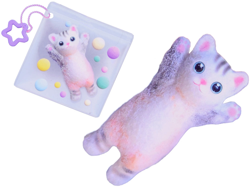 Odkrijte zabaven DIY set, s katerim si otroci sami izdelajo ljubek mačji obesek. Zmešajo maso, jo pobarvajo, okrasijo s pomponi, zvezdicami in mehkim »perjem« ter končano mucko shranijo v okrasno vrečko z verižico. Rezultat je antistresen, mehak in prijeten talisman, ki ga lahko nosijo vedno s seboj.