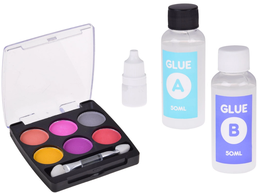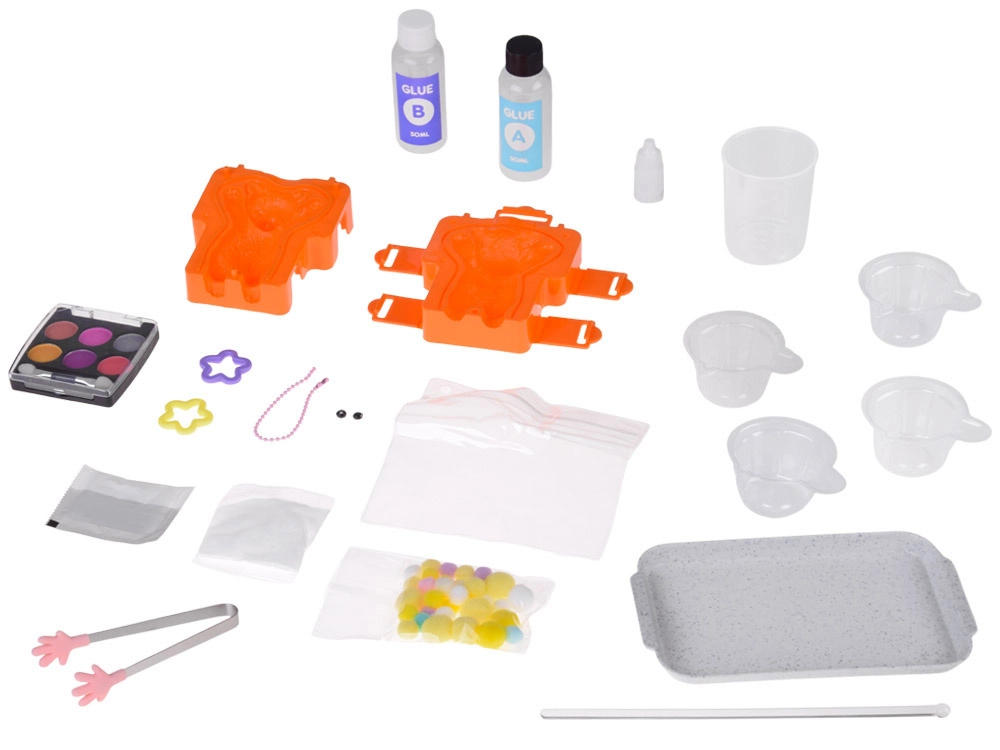 Set vsebuje kalup, kleščice, mešalnik, lepila, pigment, mehke kroglice, zvezdice, oči, okrasno vrečko, verižico in drugo – začnete lahko takoj.