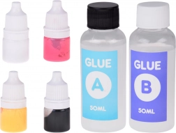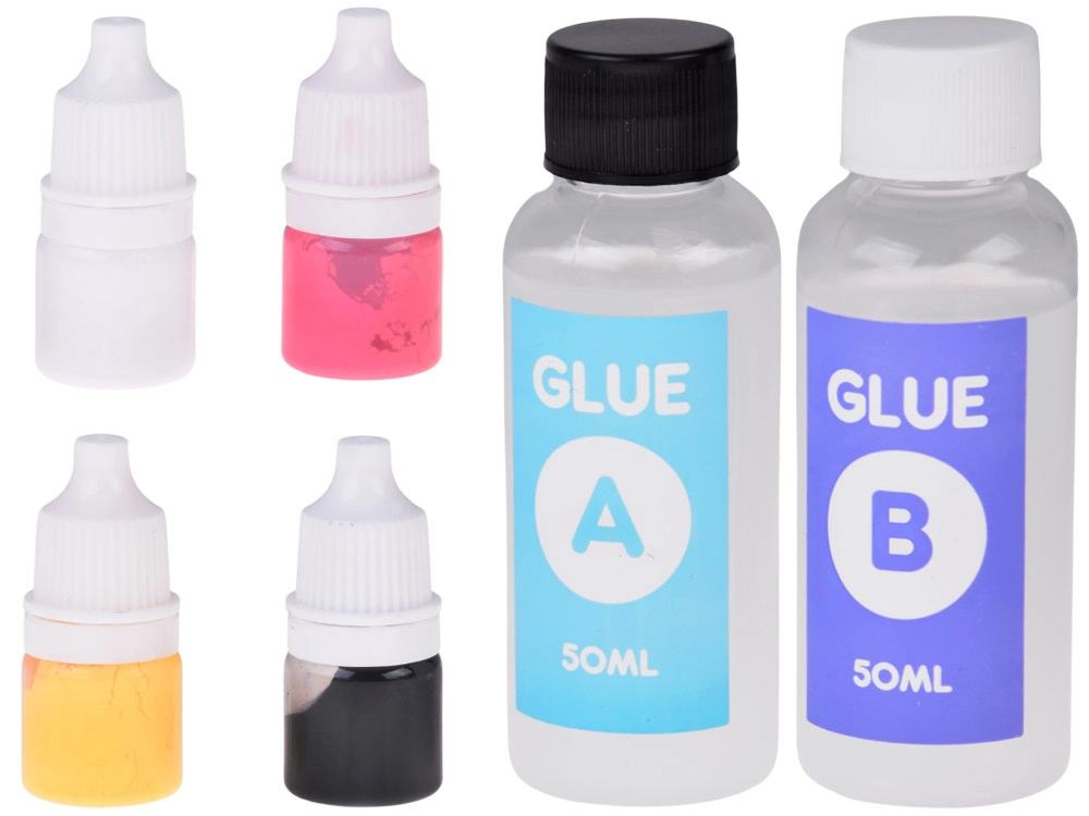 - Kalup za 4 sluzi, mešalna lopatica, plastični nožek, 2× lepilo (A+B), merilni lonček, 4× barvilo, mehke okrasne kroglice, zaščitne rokavice, 4× zvezdica, 4× prozoren lonček, 4× okrasna vrečka, 4× verižica za obesek za ključe, pladenj