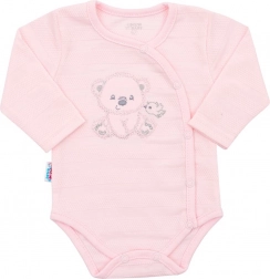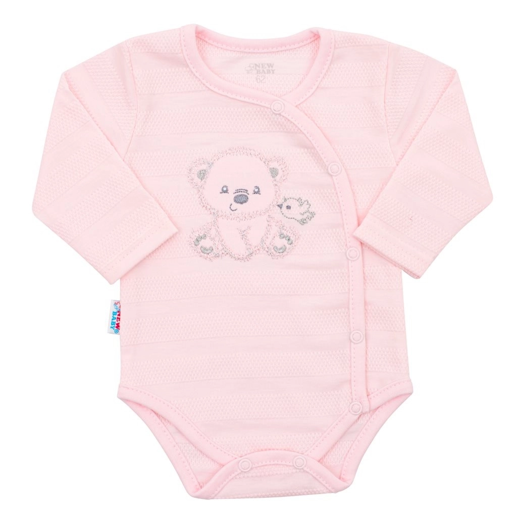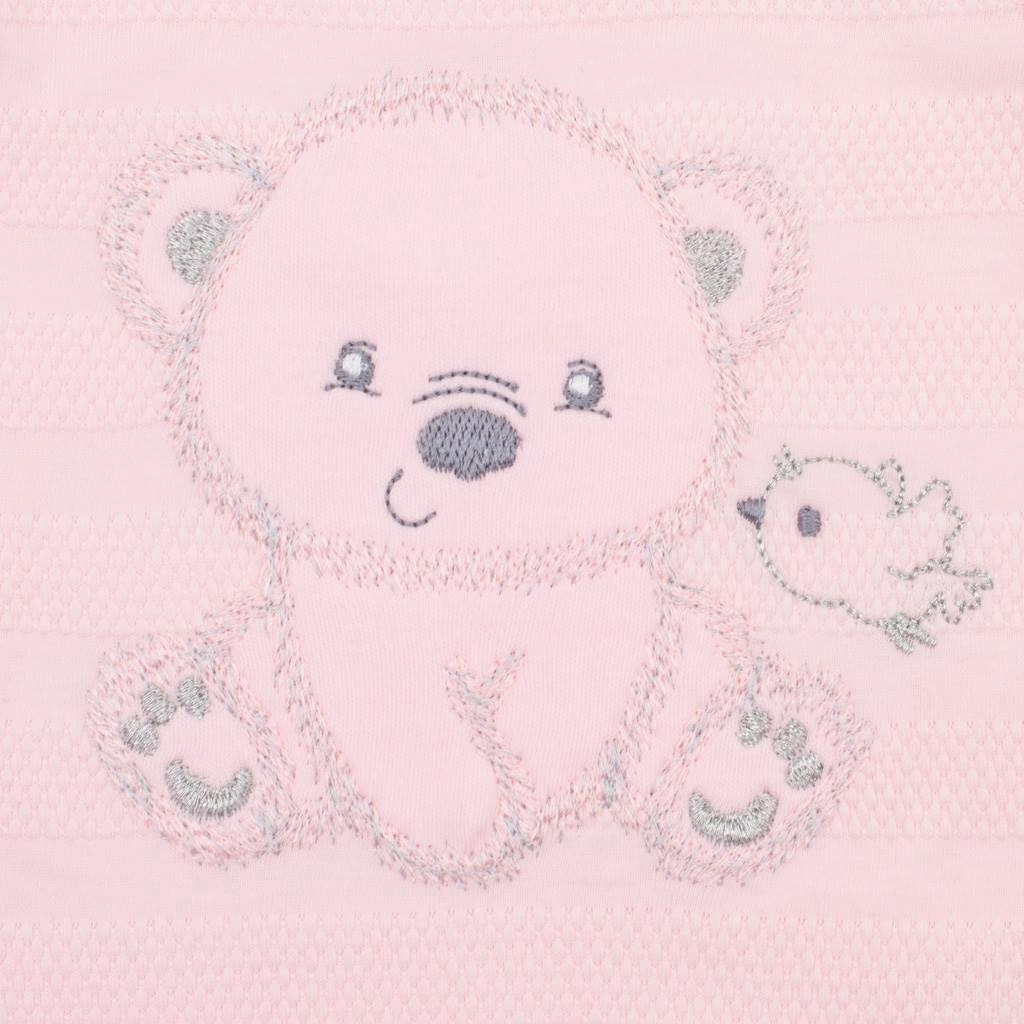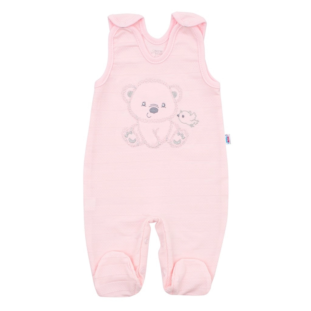 Dojenčkov komplet New Baby Sweet Bear v rožnati barvi prinaša udobje, funkcionalnost in nežen dizajn v prve mesece dojenčka. Bodij z dolgimi rokavi z zapenjanjem po celotni dolžini in hlačke z nogavičkami s pritiskači na naramnicah in med nožicami olajšajo preoblačenje in previjanje. Jopica je enobarvna z nežnim robnim zaključkom in zapenjanjem po vsej dolžini, kapica se zavezuje z vrvicami in odlično pokrije ušeska.