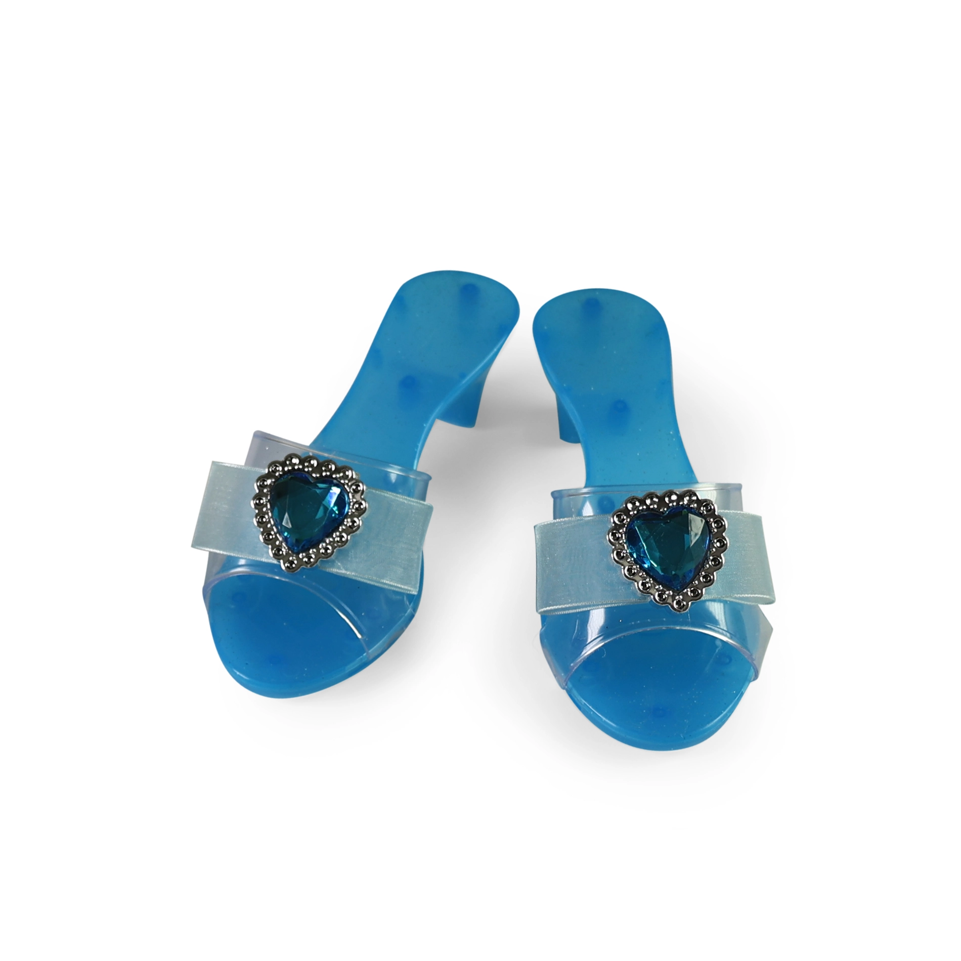 Lahki plastični čeveljčki s prozornim paščkom in modrim srčastim kamnom se enostavno obujejo in odlično dopolnijo vsak kostum.