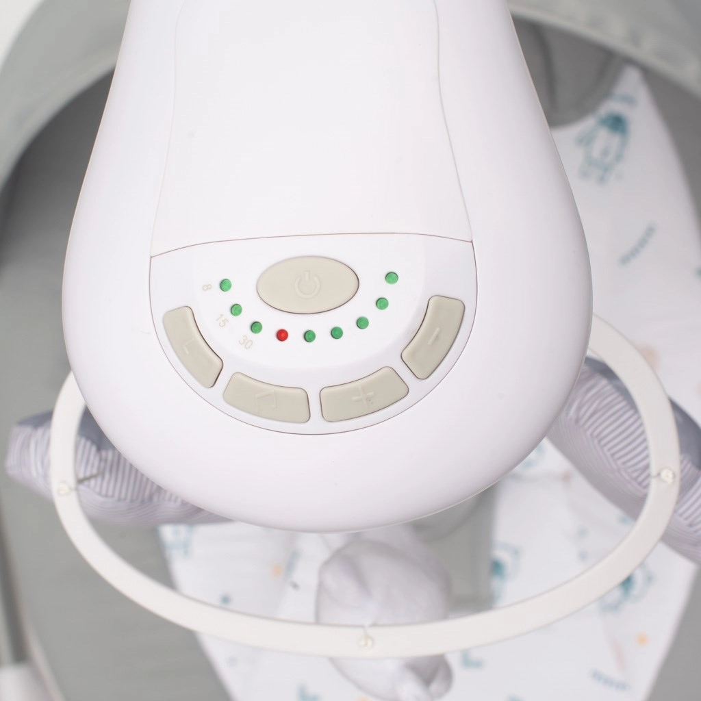 Izbirajte med 4 hitrostmi guganja in 3 stopnjami vibracij za nežno pomiritev dojenčka. Časovnik lahko nastavite na 8, 15 ali 30 minut za udobno samodejno delovanje.