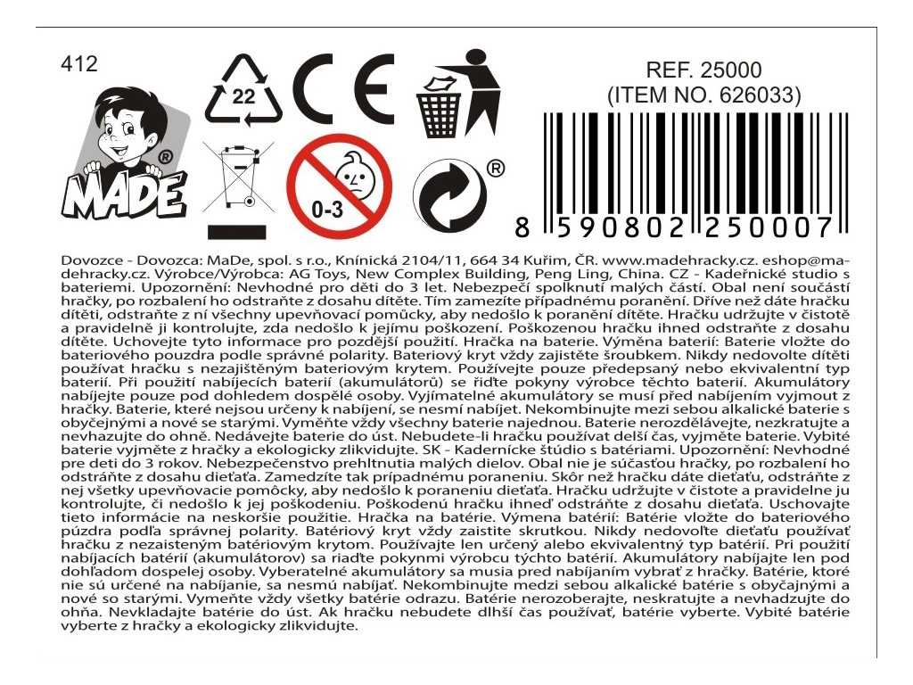 Igrača je izdelana iz odporne plastike in je zapakirana v škatlo z okencem, zato je odlična tudi kot darilo. Mere 20 × 7 × 26 cm omogočajo enostavno shranjevanje in prenašanje.