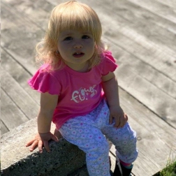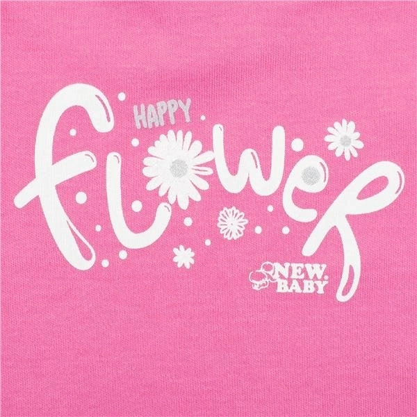Ta praktičen in moderen komplet New Baby Happy Flower je idealen za vsakodnevno nošenje in domače udobje. Majico krasi nežen napis Happy Flower, nabrani rokavčki pa dodajo igriv dekliški videz. Udobno zapenjanje na pritiskač pri vratku na zadnji strani olajša oblačenje.
