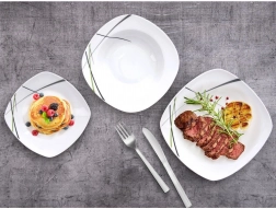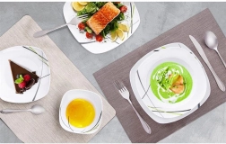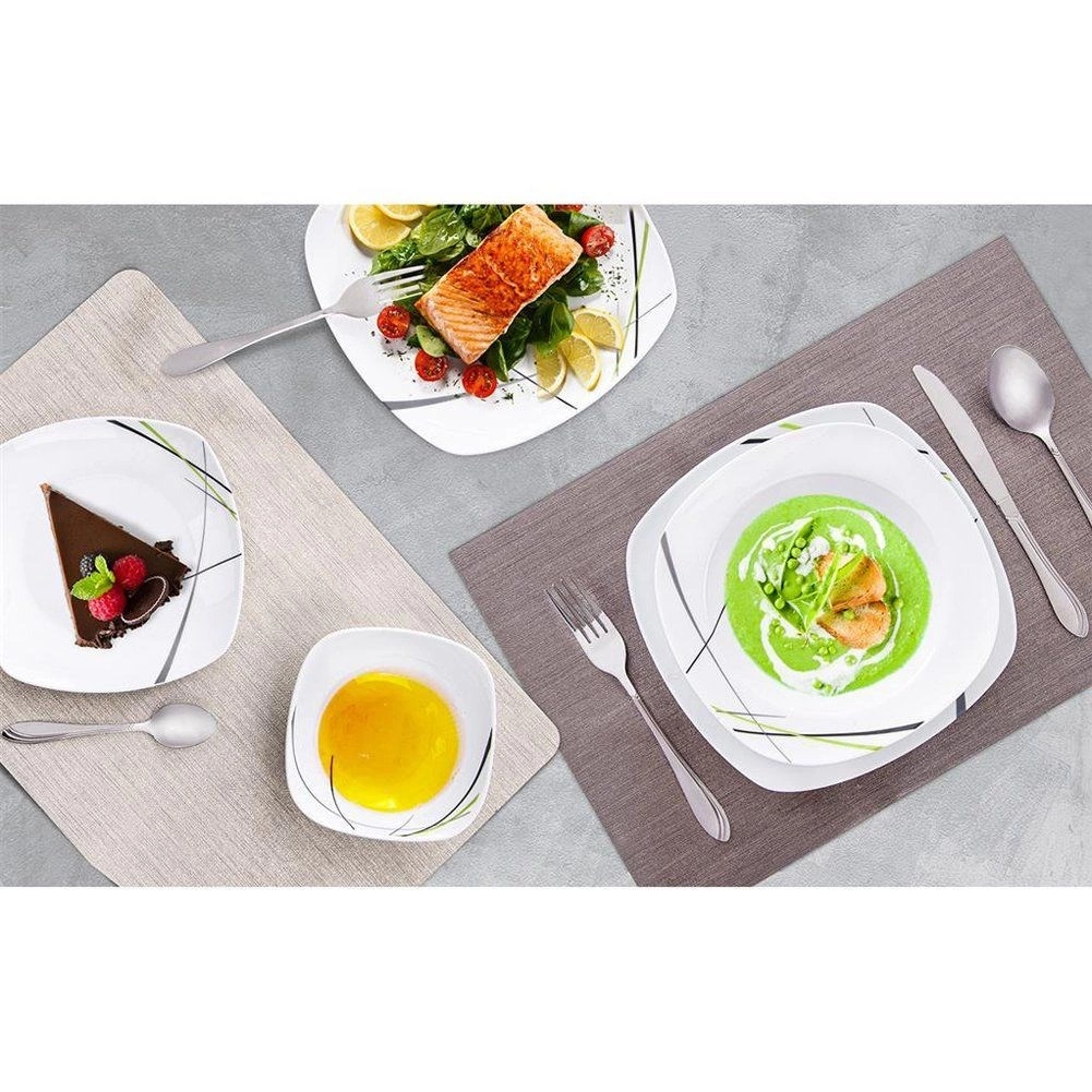 Ta kvadratni jedilni set iz kakovostnega porcelana prinaša stil in praktičnost v vsak dom. Sodobni dekor v kombinaciji zelene, črne in sive barve lepo izstopa na mizi ter ga zlahka uskladite z ostalo opremo. Je idealen za zajtrke, kosila in večerje ter odlično služi pri družinskih srečanjih in slavnostnih pogostitvah.