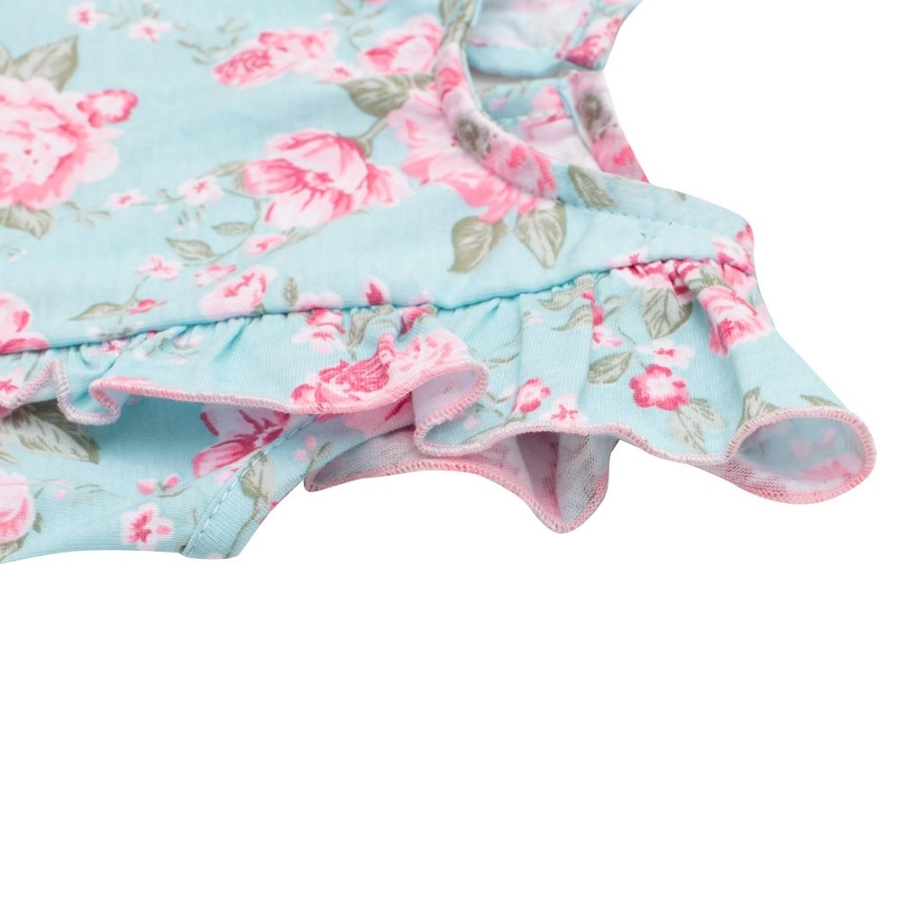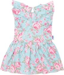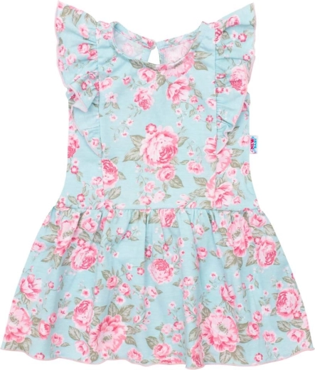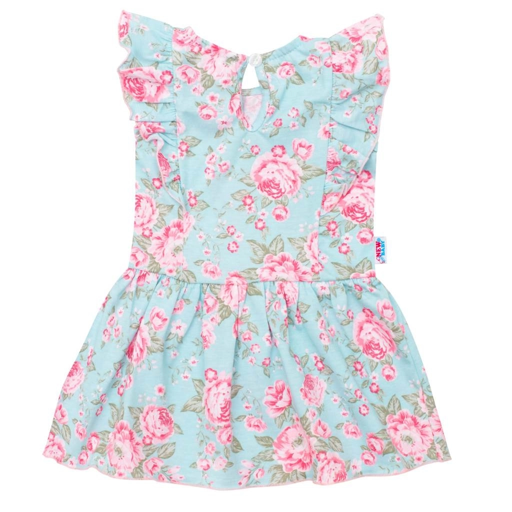 Privoščite svoji mali princeski udobje in šarm. Ta poletna bombažna oblekica NEW BABY Roses navduši z nežno svetlomodro osnovo s potiskom rožnatih cvetov, volančkastimi rameni in nabrano krilcem za lepo poln videz. Mehak, zračen material zagotavlja celodnevno udobje.