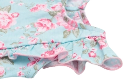 Svetlomodrna osnova s potiskom rožnatih cvetov in volančkastimi detajli oblekici daje očarljiv videz za vsako priložnost.