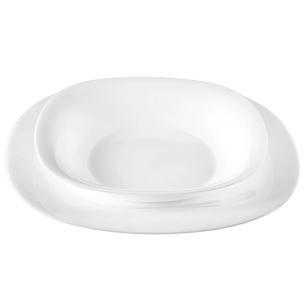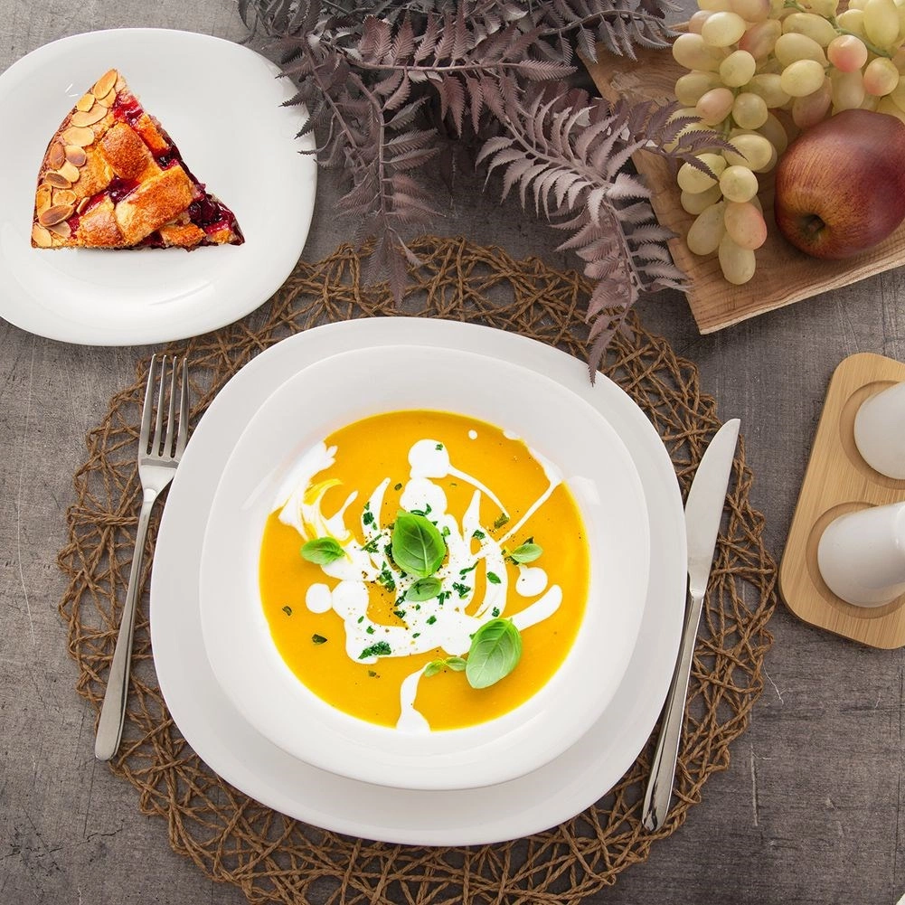Jedilna garnitura LUNA prinaša čist, minimalističen dizajn, ki je odličen za vsakodnevno obedovanje in praznične priložnosti. Zaradi kvadratne oblike z zaobljenimi vogali deluje moderno in elegantno, sijoča bela površina pa se lepo poda k vsaki pogrnjeni mizi.
