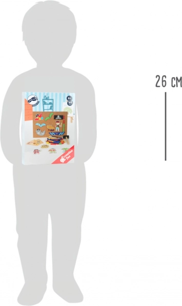 Ta piratski zabijalski set small foot je idealna izbira za ustvarjalno igro otrok od 6 let naprej. Barvni leseni koščki s piratskimi motivi se s pomočjo zlatih žebljičkov preprosto pritrdijo v prožno plutovinasto podlago in ustvarjajo izvirne »kovane« slike. Priložene so tudi štiri obojestransko natisnjene kartice s predlogami, ki ponujajo navdih in spodbujajo domišljijo.