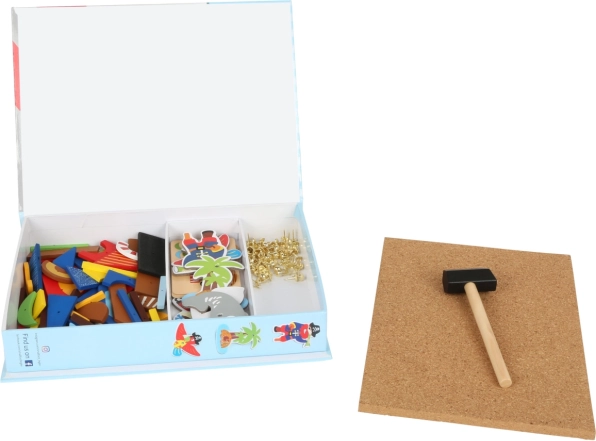 - leseni koščki s piratskimi motivi, zlati žebljički, prožna plutovinasta deska, leseno kladivce, 4 obojestranske kartice s predlogami, shranjevalni box