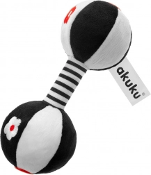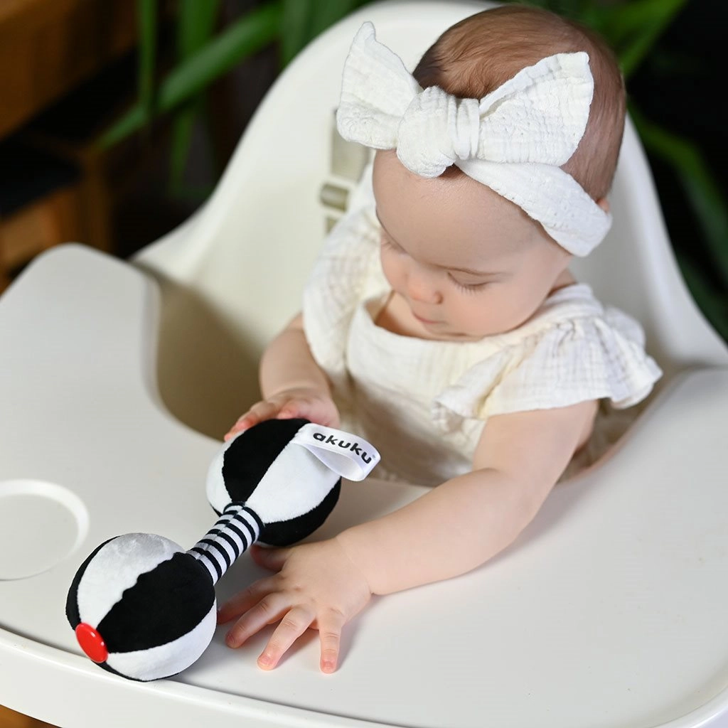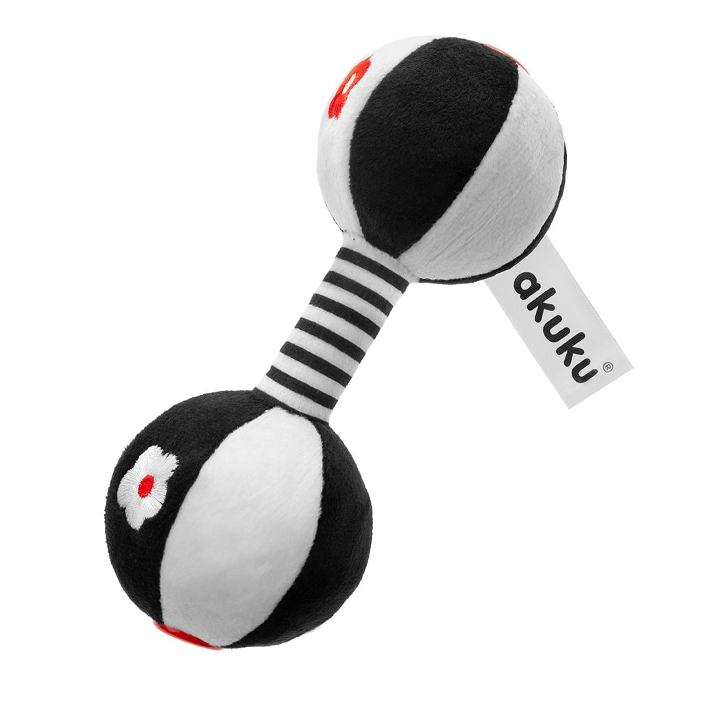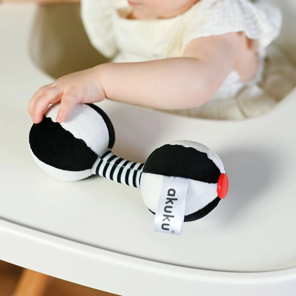 Ta kontrastna igrača v obliki uteži je izdelana iz prijetne plišaste tkanine, ki je nežna do občutljive dojenčkove kože. Kontrastni črno-beli elementi dojenčka pritegnejo in spodbujajo vizualno zaznavanje od prvih dni. V notranjosti so nameščeni nežni zvončki, ki ob gibanju oddajajo zvok in pomagajo razvijati slušne zaznave.