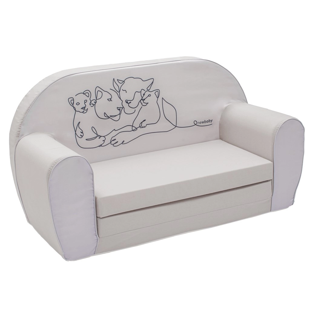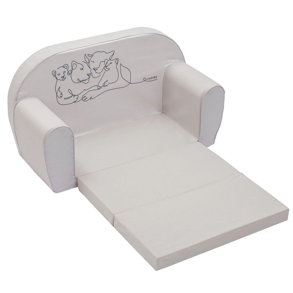 Stilna otroška raztegljiva zofa New Baby je idealna za vsako otroško sobo. Izdelana je iz mehke in lahke poliuretanske pene, ima odstranljiv bombažen prevlek z zadrgo in nudi varno ter udobno sedenje brez trdih delov. Prijeten svetlo siv dizajn z motivom dinozavra se odlično poda k otroški notranji opremi in vabi k počitku ter igri.