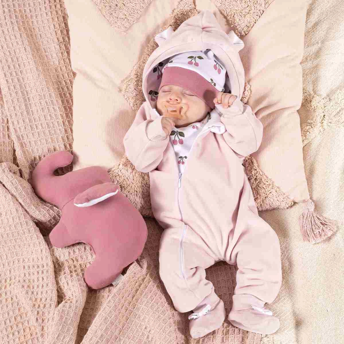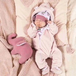 Praktični detajli, kot so zavihljivi rokavčki in kapuca z ljubkimi ušeski, ga naredijo idealno izbiro za vsakodnevne sprehode in vožnje v vozičku. Material dolgoročno ohranja svojo obliko in videz, zato pajac odlično izgleda tudi po več pranjih.