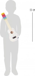 Ta lahka in trpežna lesena kitara je ustvarjena za male glasbenike. Zaradi kompaktnih mer jo otroci udobno držijo, hkrati pa pomaga razvijati koordinacijo, ritem in občutek za glasbo. Vesel pikčast dizajn pritegne na prvi pogled in spodbuja k igranju.