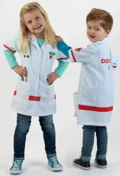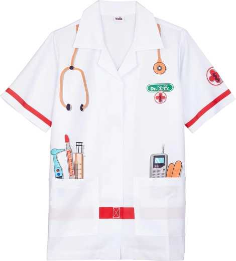 Stilski otroški zdravniški plašč znamke KLEIN za male zdravnike in zdravnice, starosti 3–5 let. Lahek material iz 100 % poliestra, kratki rokavi, zapiranje na ježka in dva praktična žepa. Bel plašč krasijo barvni potiski zdravniških pripomočkov, kot so stetoskop, termometer in brizga – idealno za igranje vlog in preobleke.