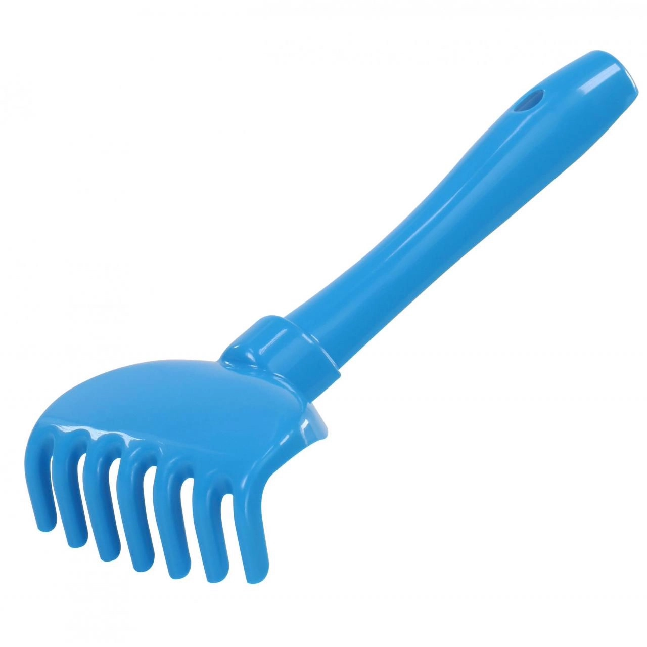 Kratek ročaj z odprtino za obešanje in široki zobje olajšajo grabljenje peska ter shranjevanje po igri.
