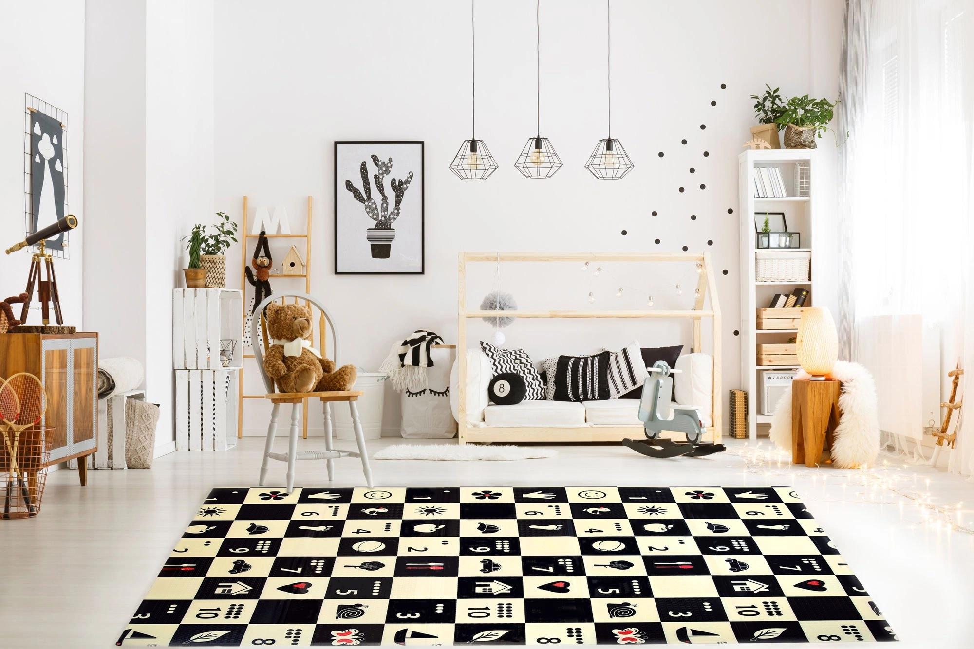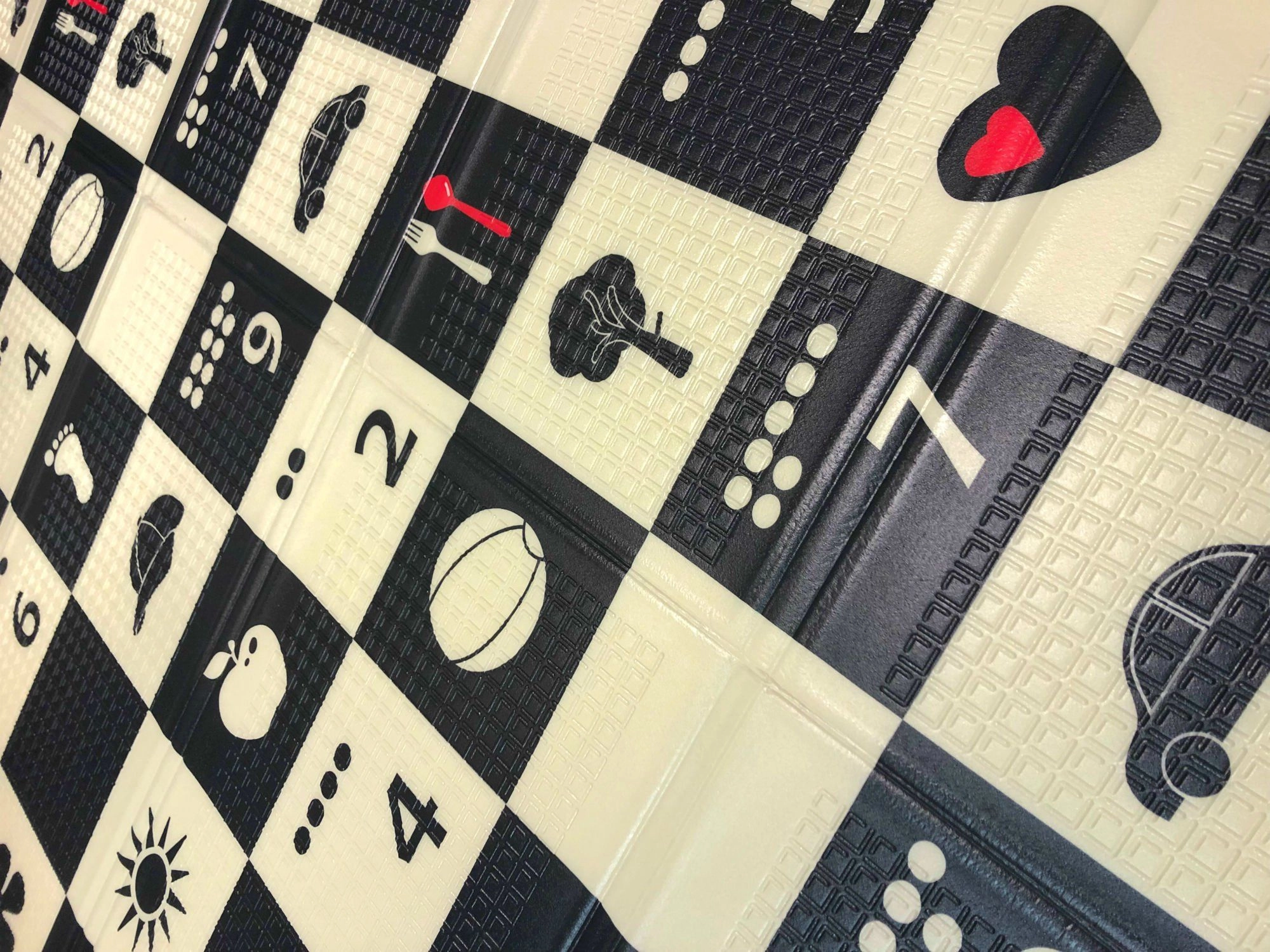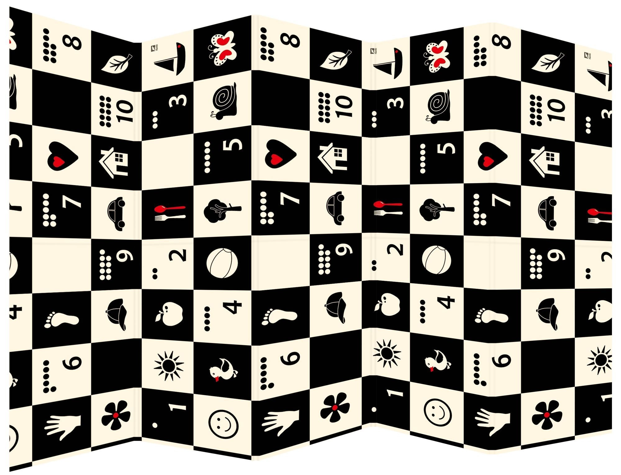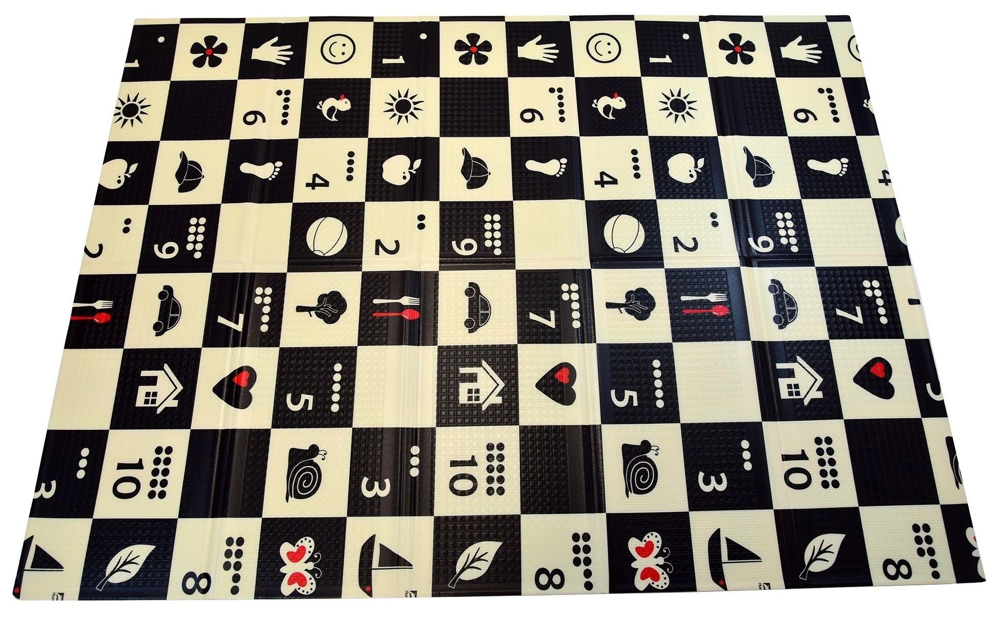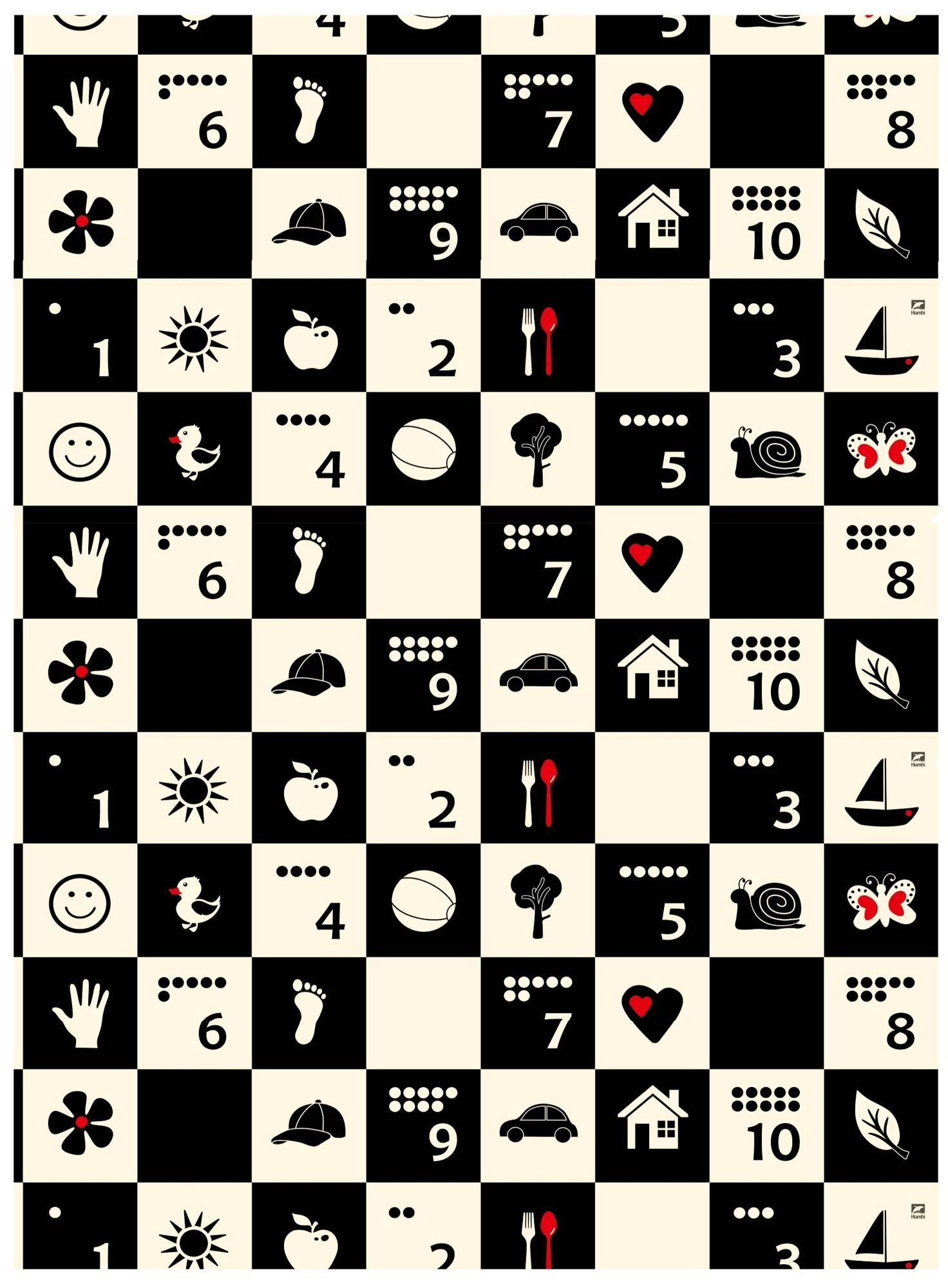 Črno-bela šahovnica z enostavnimi ikonami spodbuja vid, podpira vizualno-prostorsko inteligenco in pritegne pozornost dojenčkov.