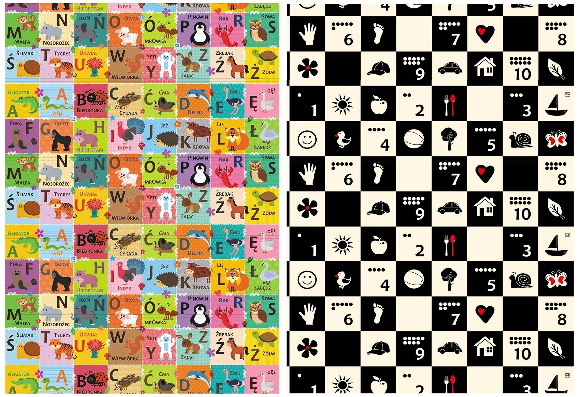 - Dvostranski dizajn: kontrastne številke in simboli + barvita abeceda z živalmi