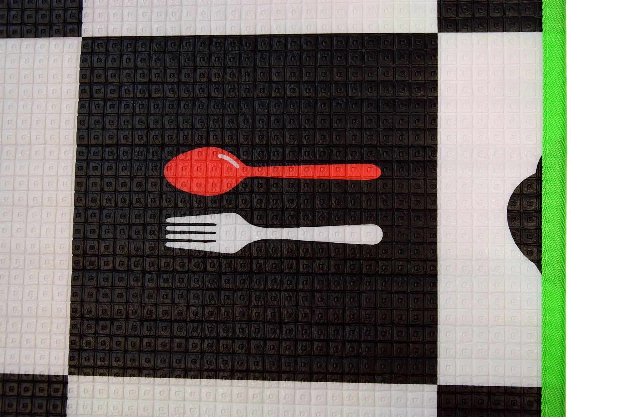 Podloga je izdelana iz varne, netoksične in brezvonjske EPE pene, ne vsebuje formamida, ftalatov, PVC ali BPA in ustreza standardom EN71-1, EN71-2, EN71-3 ter REACH. Je vodoodporna, preprosta za vzdrževanje in zaradi površine z nežno reliefno strukturo tudi protizdrsna. Hitro zavijanje v rolo olajša prenašanje – torba z zadrgo je priložena.