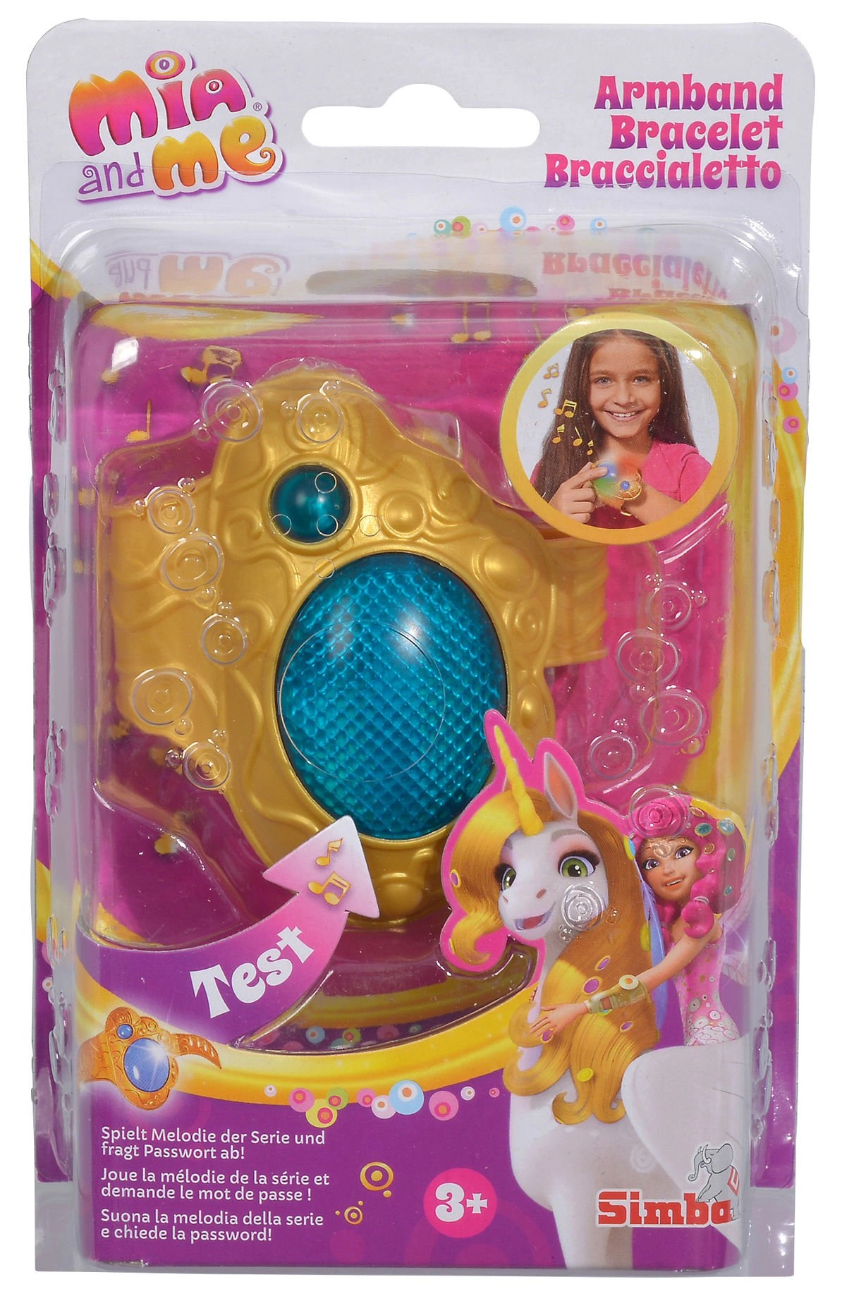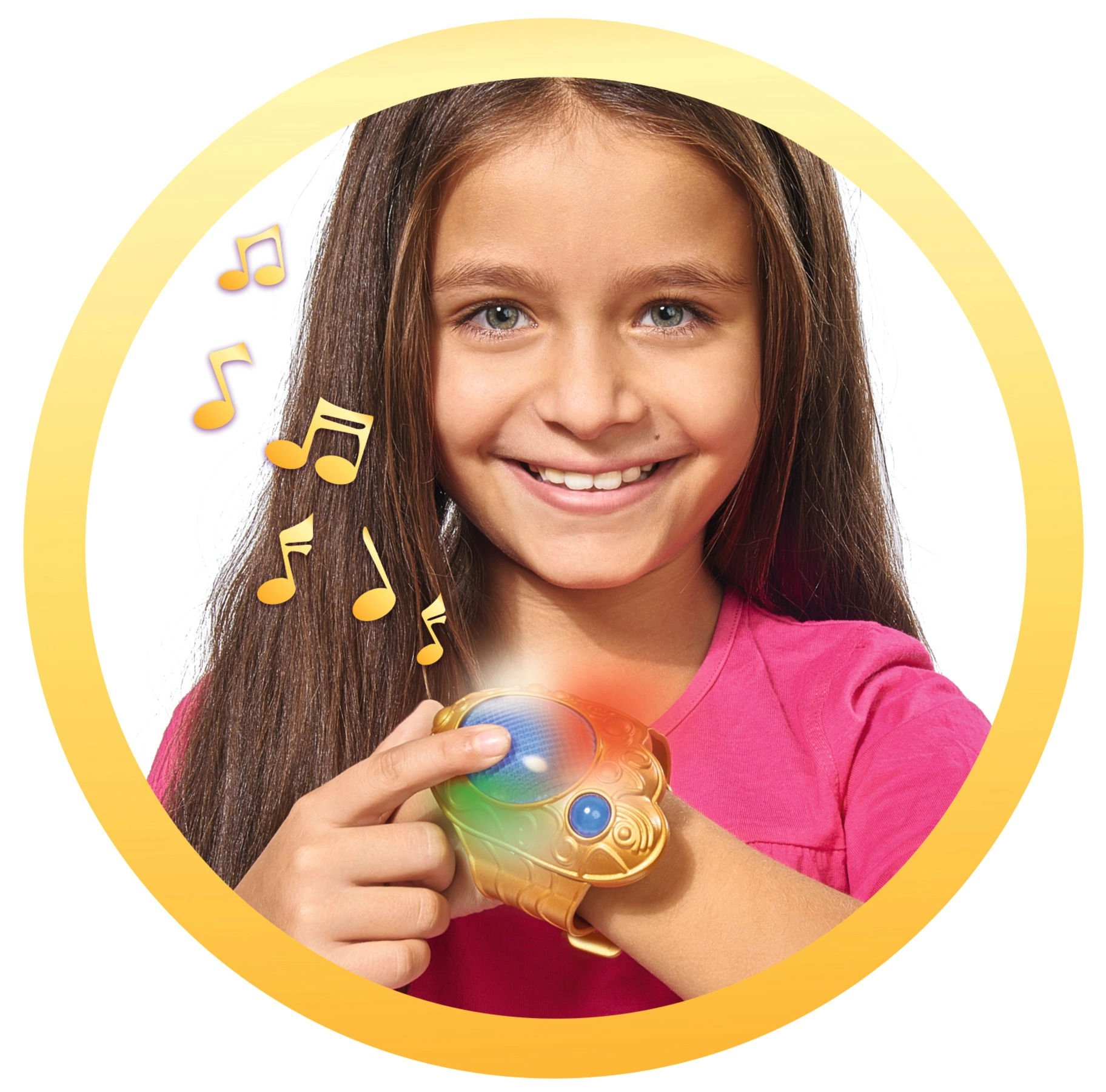 Odkrijte magijo kot Mia! Elegantna zapestnica v zlati barvi z ikoničnim modrim kamnom vam omogoča, da znova podoživite priljubljene prizore iz serije Mia in jaz. Ob pritisku na kamen se zapestnica zasveti v barvah in zaigra znana melodija – veselje in čarovnija na dosegu roke.