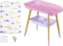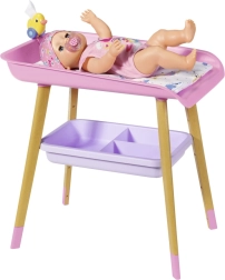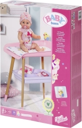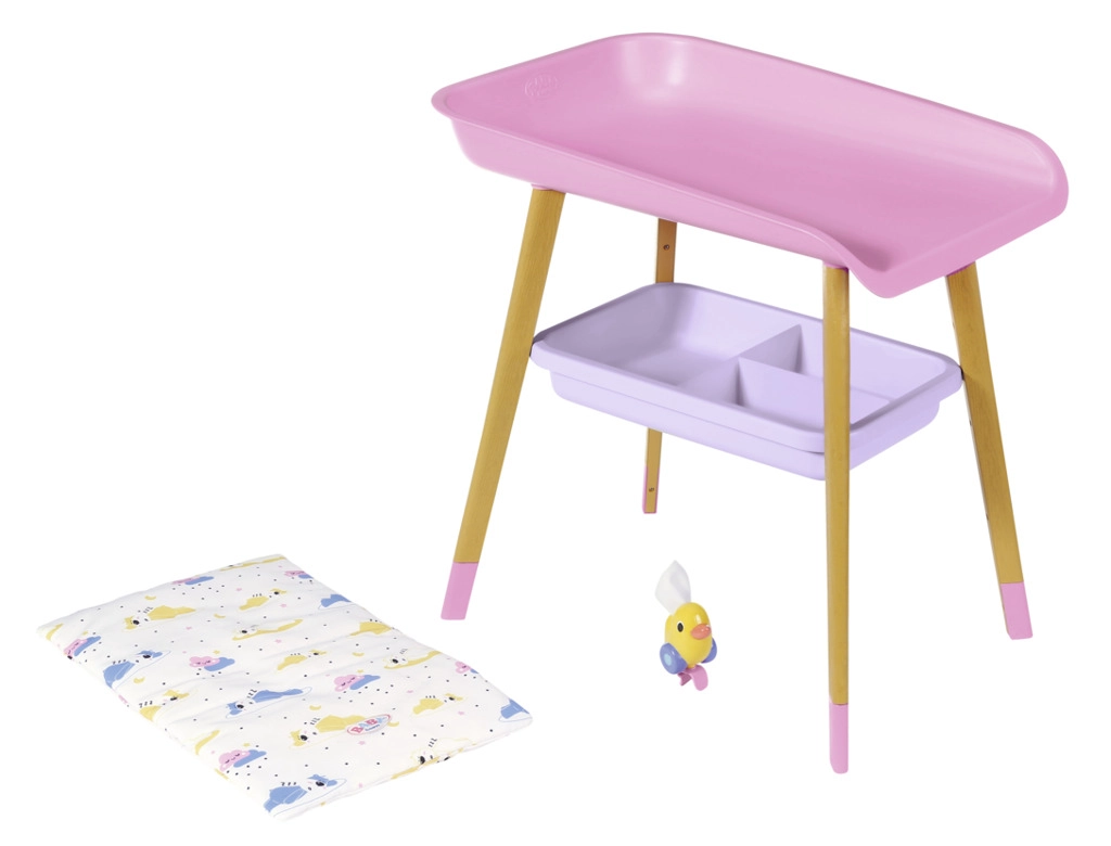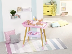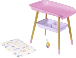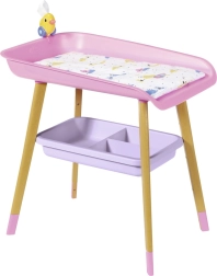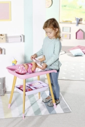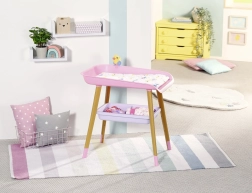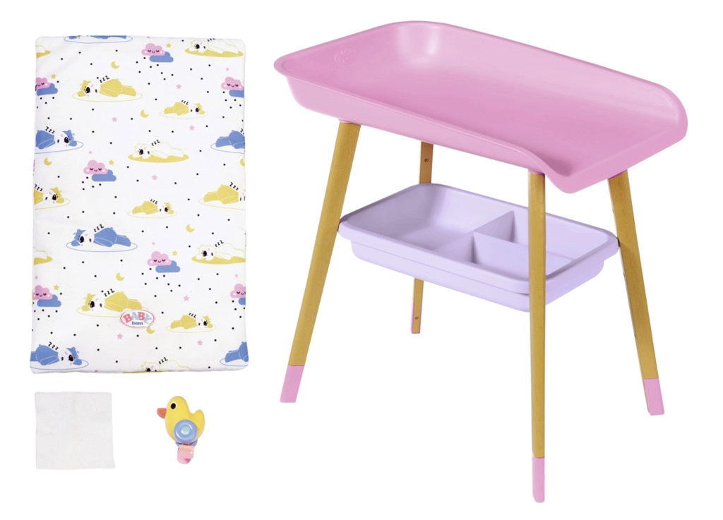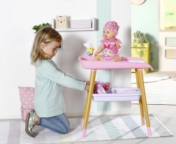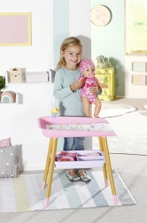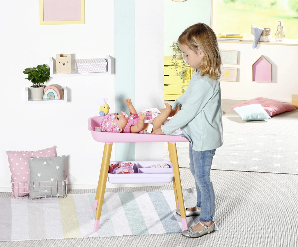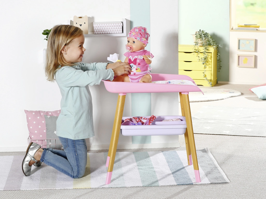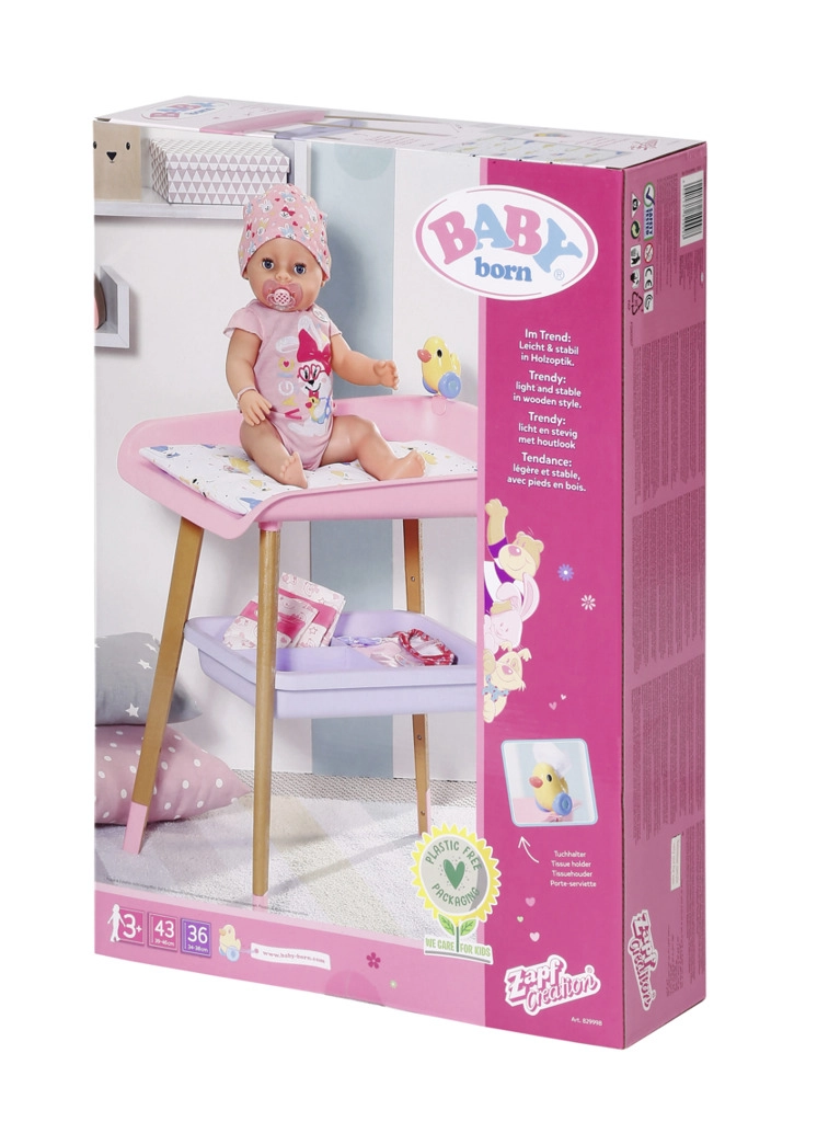 Stilska previjalna miza za punčke BABY born otrokom prinaša realistično nego v igri. Ima noge v lesnem dekorju, mehko previjalno podlogo, odstranljiv dozirnik robčkov z račko in praktične pregrade za plenice, oblačila in dodatke. Odlično dopolni otroško sobo in se ujema z drugimi dodatki BABY born.