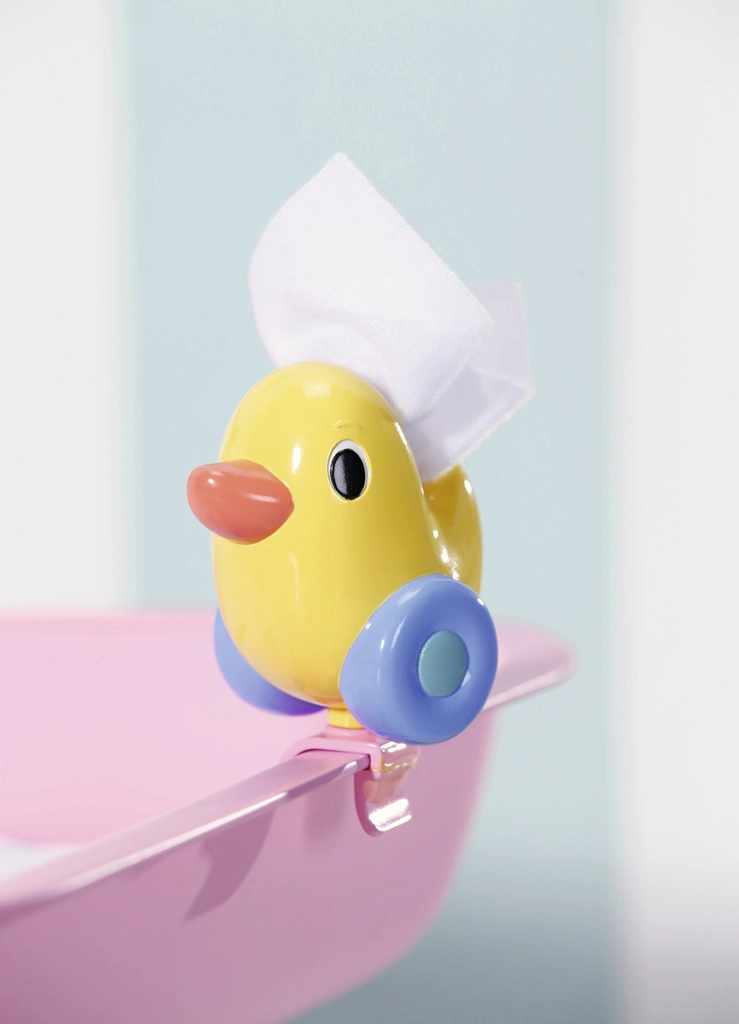 Igriv sponkasti klip v obliki račke drži robčke vedno pri roki – idealno za hitro in realistično previjanje punčk.