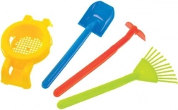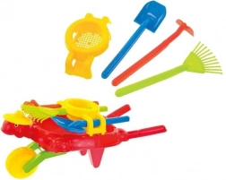 Veliko, premično kolo zagotavlja gladko in stabilno vožnjo po različnih podlagah, medtem ko dvojne opore omogočajo varno odlaganje samokolnice. Ergonomski ročaji so prilagojeni otroškim dlanem in omogočajo zanesljiv prijem. V paketu ne manjkajo praktični dodatki: grabljice, lopatka, motika in cedilo – idealni za prenašanje zemlje, zbiranje listja ali sejanje peska.