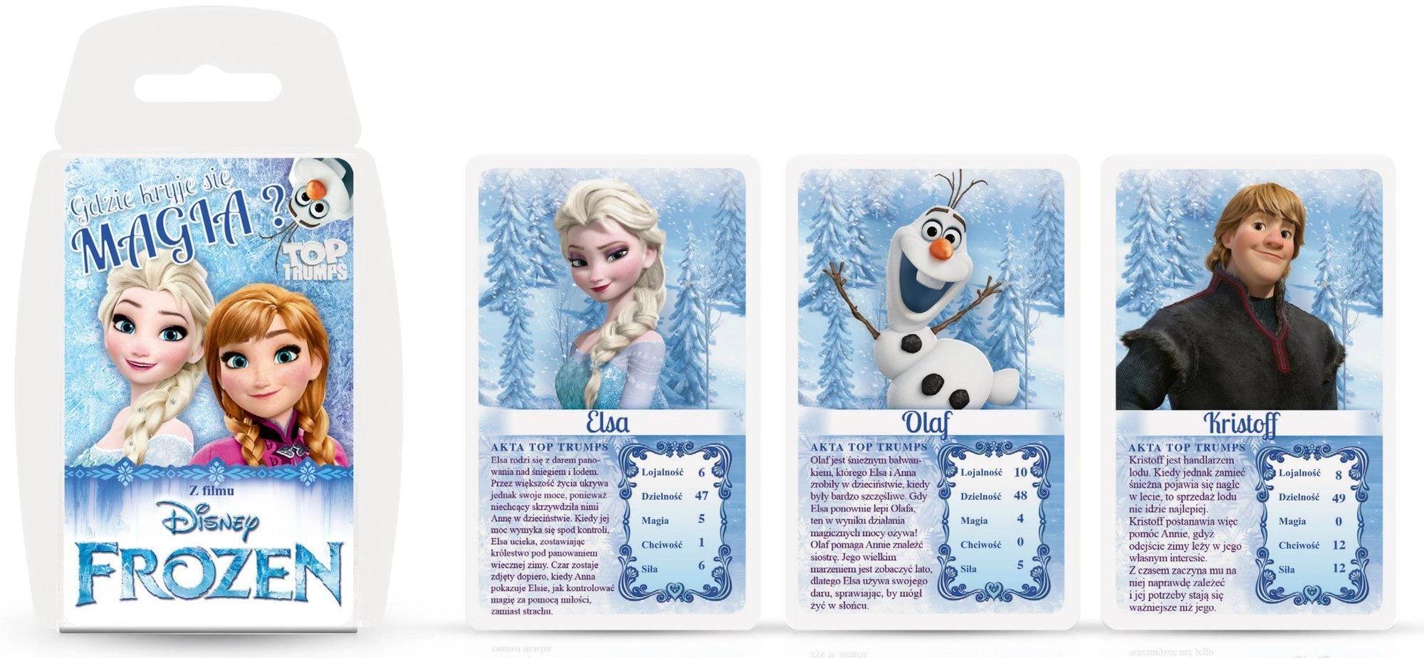 Top Trumps je priljubljena kartna igra, ki zabava družine že desetletja. V izdaji Ledeno kraljestvo se srečate z junaki iz priljubljenega filma DISNEY in primerjate njihove lastnosti, kot so magija, pogum in modrost. Cilj je izbrati višjo vrednost in osvojiti karte nasprotnikov – zmaga tisti, ki zbere celoten komplet kart.