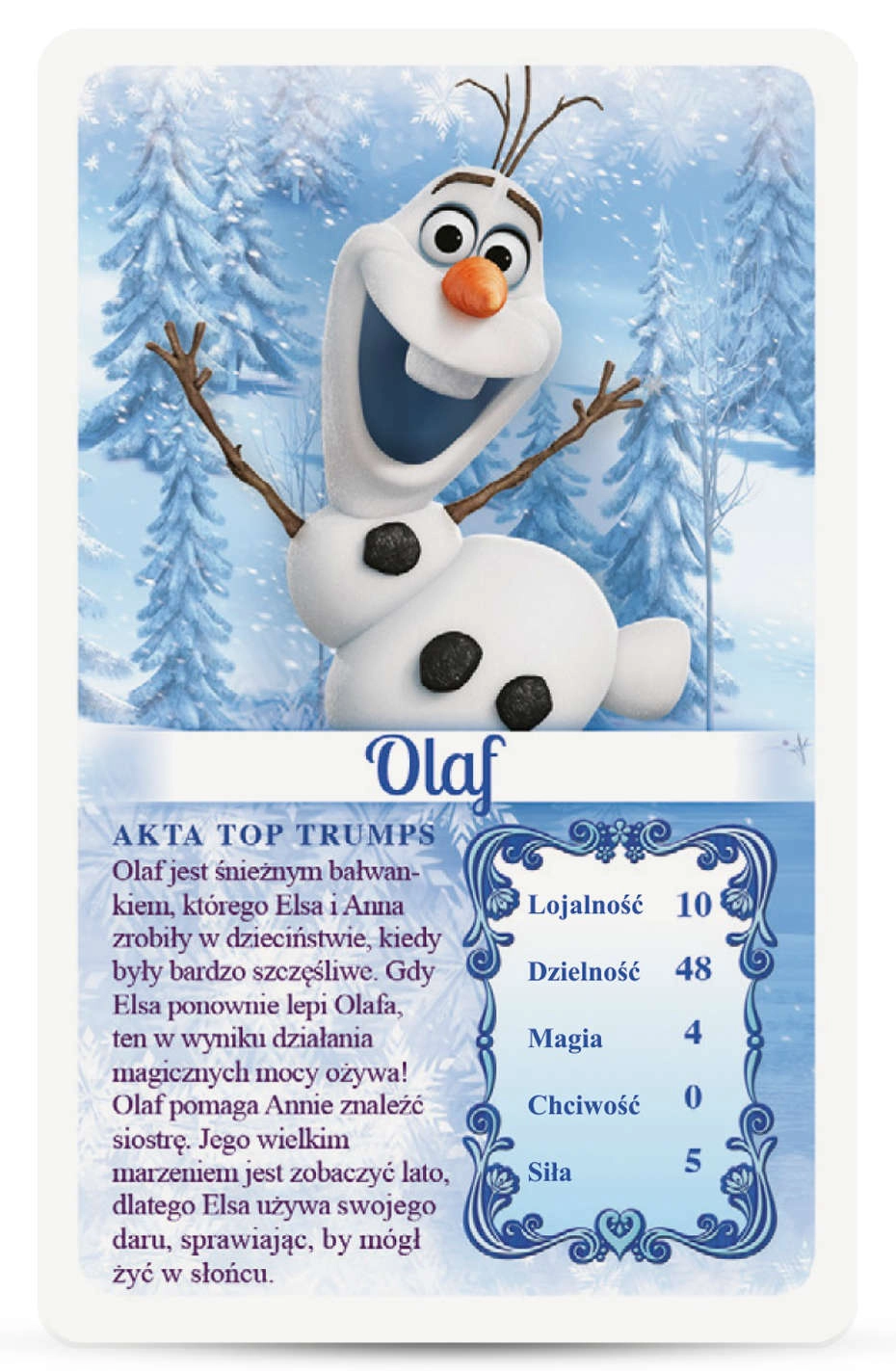 Vstopite v čarobni svet DISNEYa in uživajte v hitri in napeti zabavi s kartno igro Top Trumps na temo Ledenega kraljestva. Idealno za oboževalce Else, Ane in Olafa ter za družinske večere. Preprosta pravila, hitra igra cca 15 minut in zabava za 2 ali več igralcev naredijo to igro odlično izbiro za na pot in za dom.