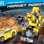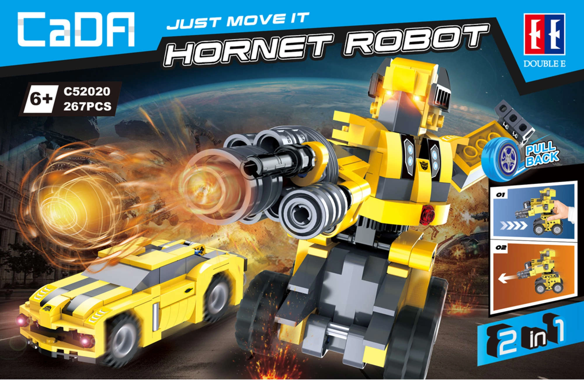 Gradbeni set CaDA Hornet iz serije Just Move It prinaša dve možnosti sestavljanja v enem paketu: sestavite pozirnega robota ali hitri avto z navijalnim pull-back pogonom. Zahvaljujoč preglednim navodilom lahko model z pomočjo odraslega sestavijo tudi mlajši graditelji.
