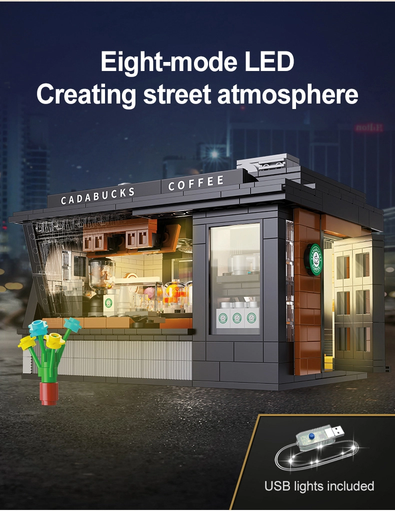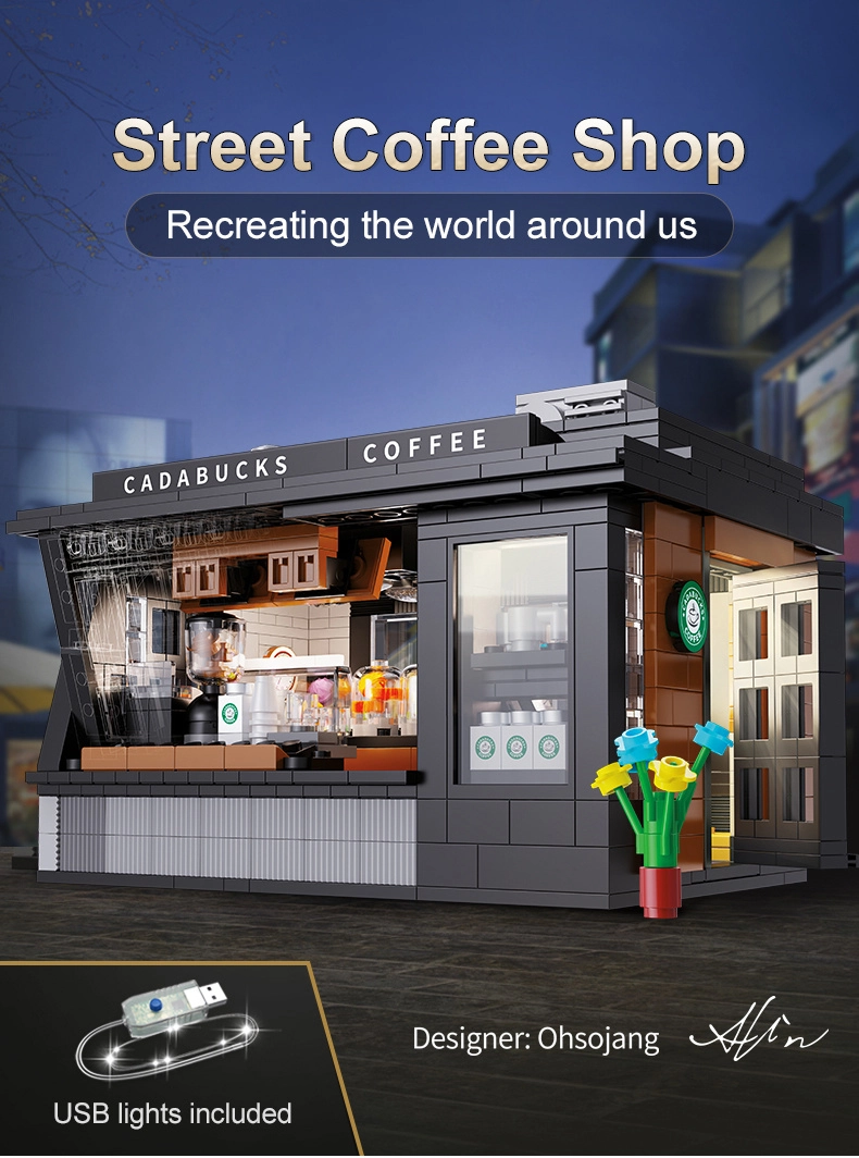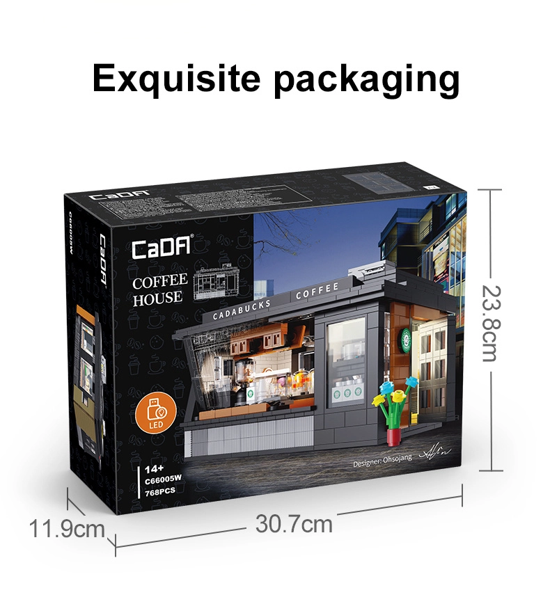 Zgradite svojo mini kavarno z modelom Cadabucks Coffee House znamke CaDA. Set vsebuje 768 kosov, podroben interier za baristo in goste ter funkcionalno LED osvetlitev za avtentično vzdušje. Odstranljiv zadnji del in streha omogočata lahek dostop v notranjost, ne manjkajo izložbe, napisi, vrata in številni realistični dodatki.