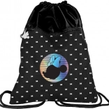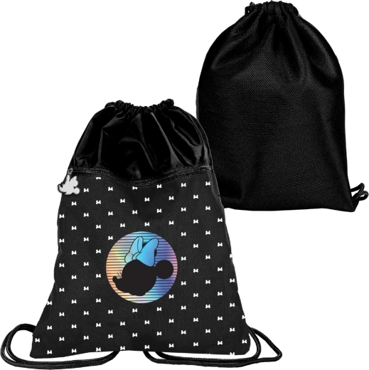 Stilski športni nahrbtnik z motivom MINNIE MOUSE v elegantni črni barvi in holografskim potiskom. Je lahke konstrukcije, ima prostoren glavni predal na zategovanje ter zadržno žep za malenkosti. Zadnji del je za udobje ojačan in zračen z mrežico, močne pletene vrvice omogočajo udobno nošenje na hrbtu ali preko rame.