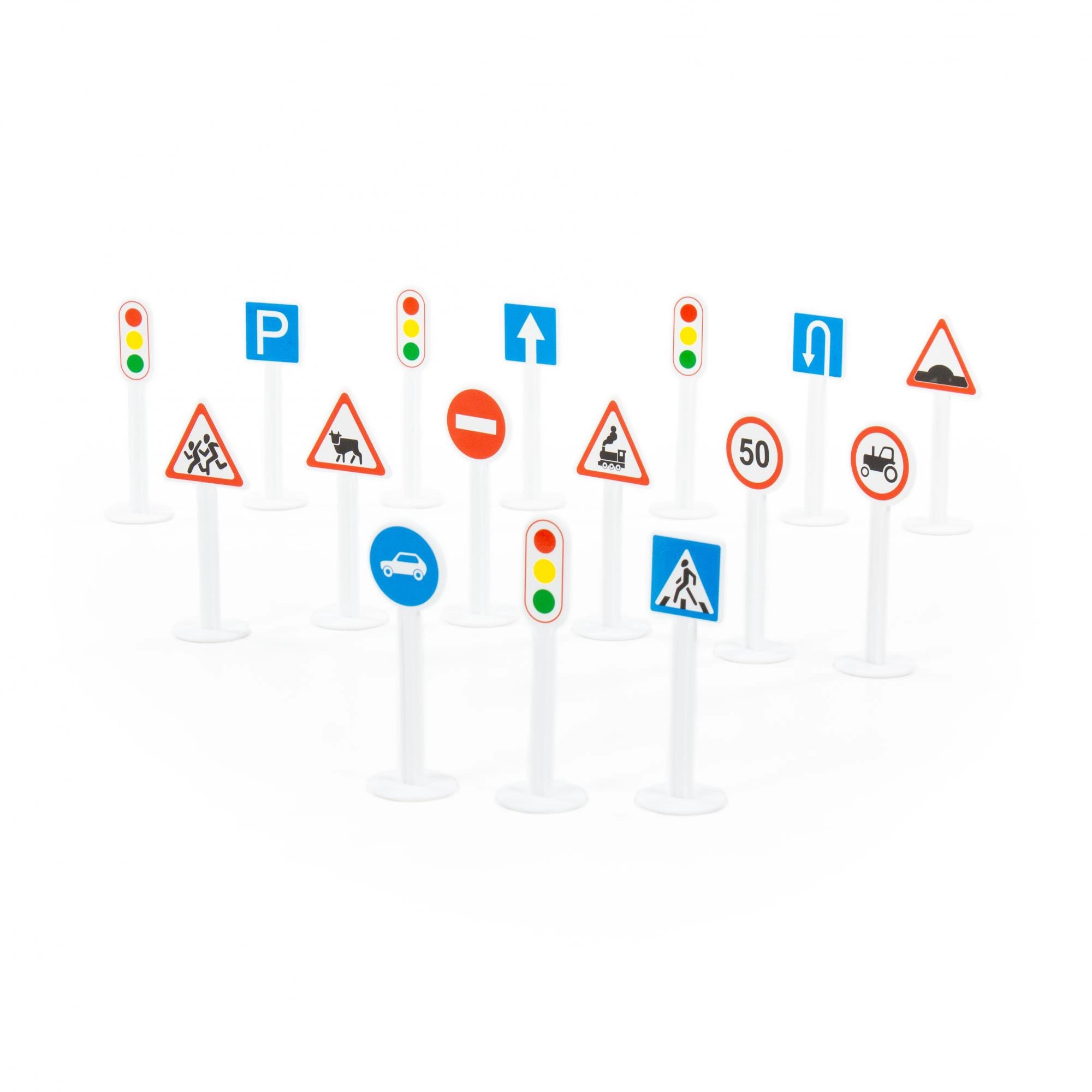 Vsebuje širok nabor simbolov – hitrost, prepovedan vstop, parkiranje, semafor, smerne puščice in druge. Idealno za modelne prometne situacije.