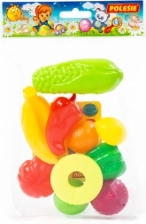 Zabaven otroški set z 10 kosi sadja in zelenjave za realistično igro kuhanja. Odličen za razvoj fine motorike, domišljije in učenja o živilih. Vključuje tudi koruzo dolgo 8,5 cm.