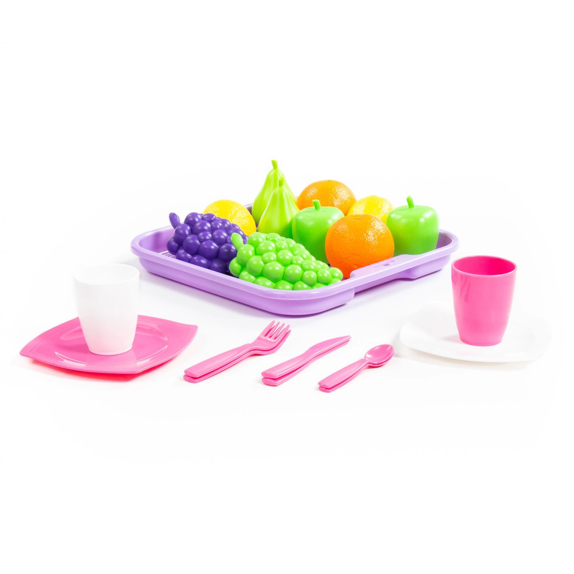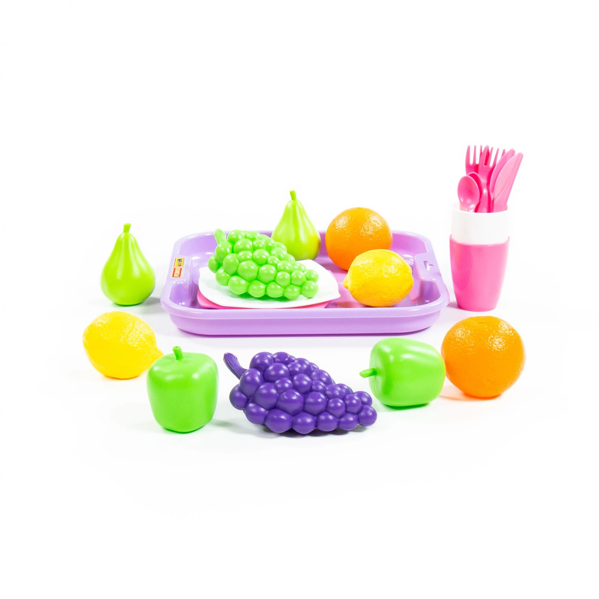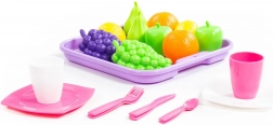 - Vsebuje sadje (jabolko, grozdje, hruška, limona, pomaranča itd.), krožničke, kozarčke in jedilni pribor.